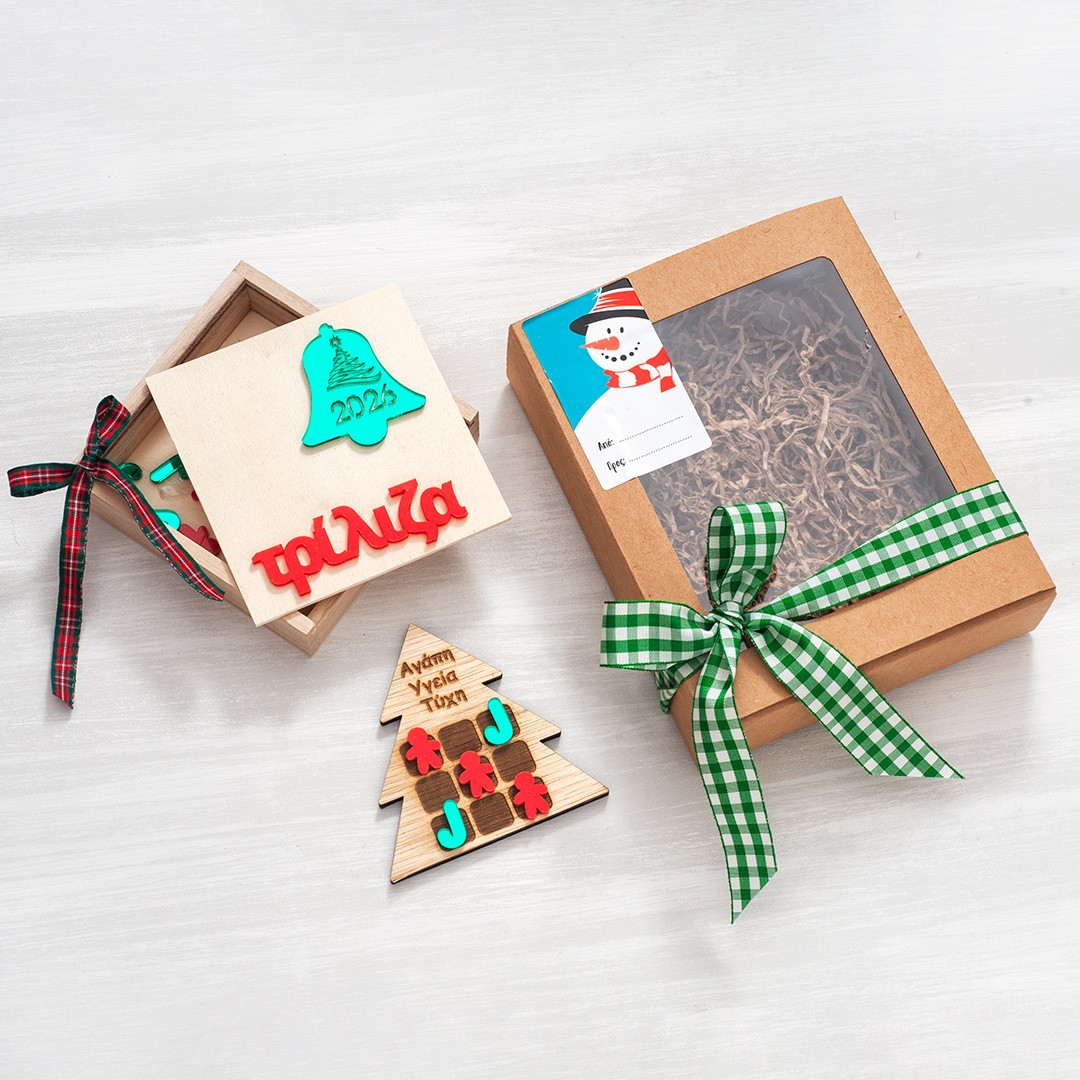 Χριστουγεννιάτικο παιχνίδι τρίλιζα σε ξύλινο κουτάκι. Το ταμπλό είναι ξύλινο σε σχήμα δέντρου με χαραγμένες ευχές. Περιλαμβάνει 10 πούλια σε χρώμα κόκκινο και πράσινο με σχήμα gingerbread και ζαχαρωτού.