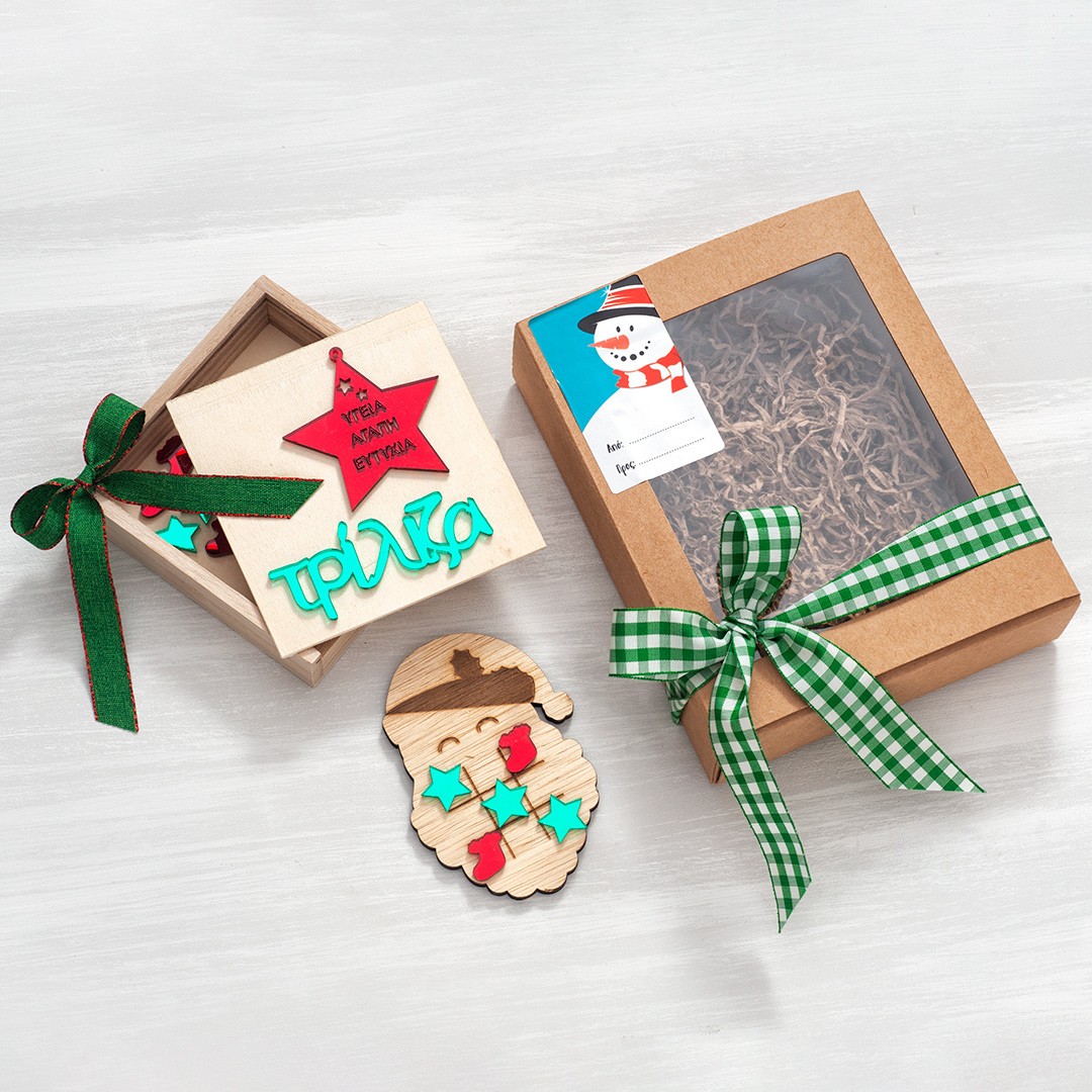Χριστουγεννιάτικο παιχνίδι τρίλιζα σε ξύλινο κουτάκι. Το ταμπλό είναι ξύλινο σε σχήμα Aι Βασίλη. Περιλαμβάνει 10 πούλια σε χρώμα κόκκινο και πράσινο με σχήμα κάλτσας και αστεριού. Στην τιμή περιλαμβάνεται το χάρτινο κουτί δώρου.