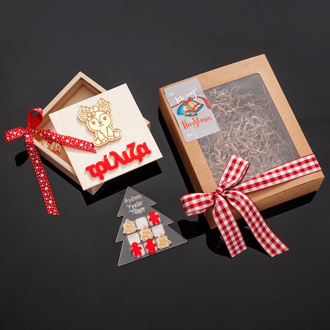 Χριστουγεννιάτικο παιχνίδι τρίλιζα σε ξύλινο κουτάκι. Το ταμπλό είναι plexiglass διάφανο σε σχήμα δέντρου με χαραγμένες ευχές. Περιλαμβάνει 10 πούλια σε χρώμα κόκκινο και χρυσό με σχήμα gingerbread και δεντράκι. Στην τιμή περιλαμβάνεται το χάρτινο κουτί δώρου.