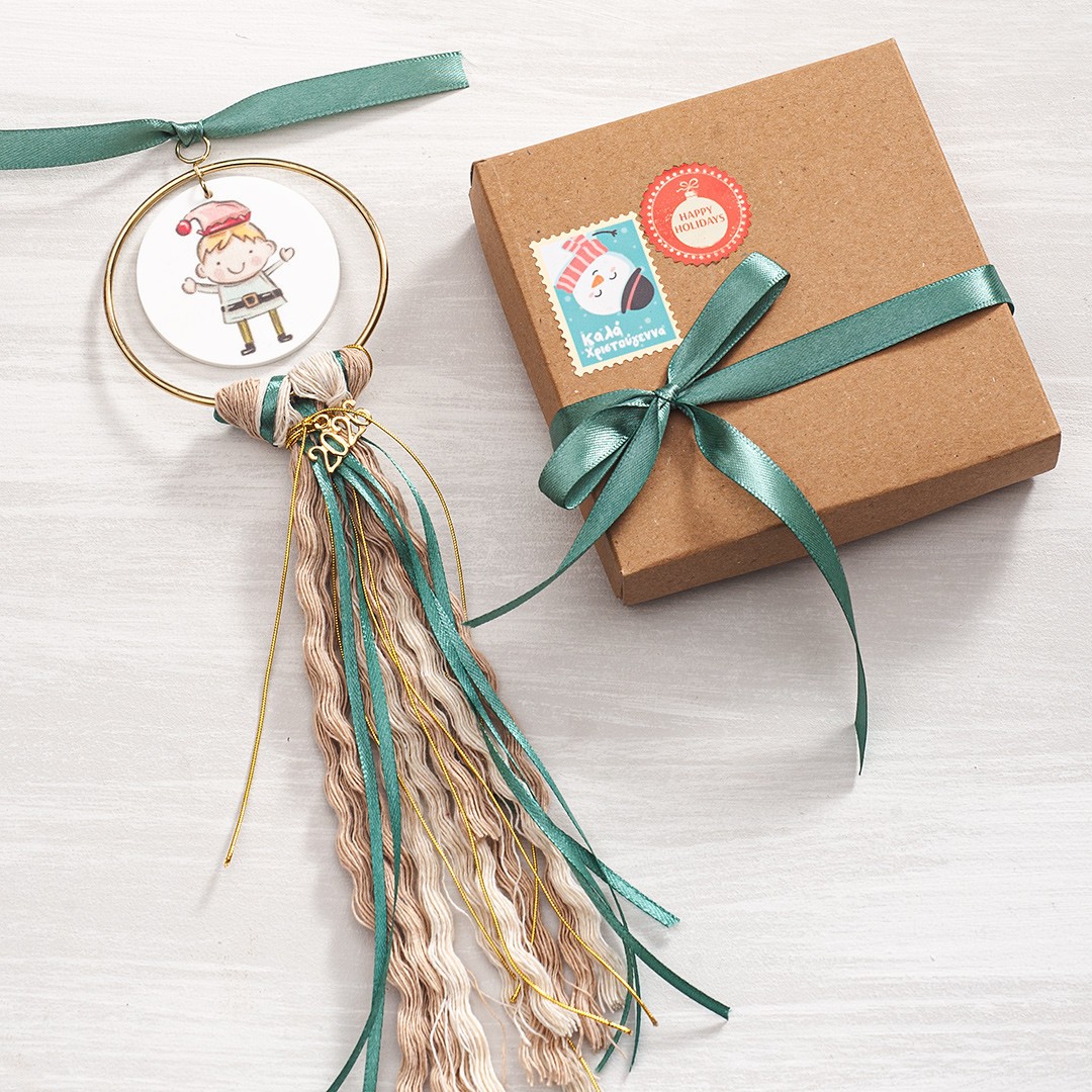 Χριστουγεννιάτικο κρεμαστό γούρι με plexiglass εκτύπωση ξωτικό σε μεταλλικό χρυσό κρίκο .Το γούρι είναι στολισμένο με κορδόνια σε εκρού και πετρόλ αποχρώσεις. Είναι τοποθετημένο σε χάρτινο κουτί craft.