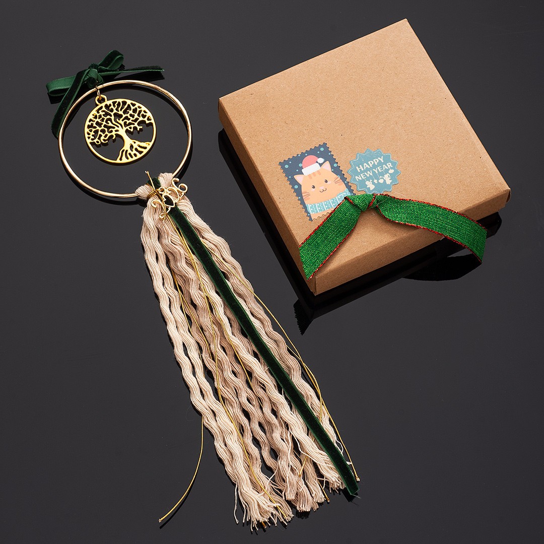 Χριστουγεννιάτικο κρεμαστό γούρι με μεταλλικό χρυσό μοτίφ δέντρο της ζωής σε κρίκο .Είναι στολισμένο με κορδόνι εκρού και πράσινη κορδέλα. Το γούρι είναι τοποθετημένο σε χάρτινο κουτί craft.
