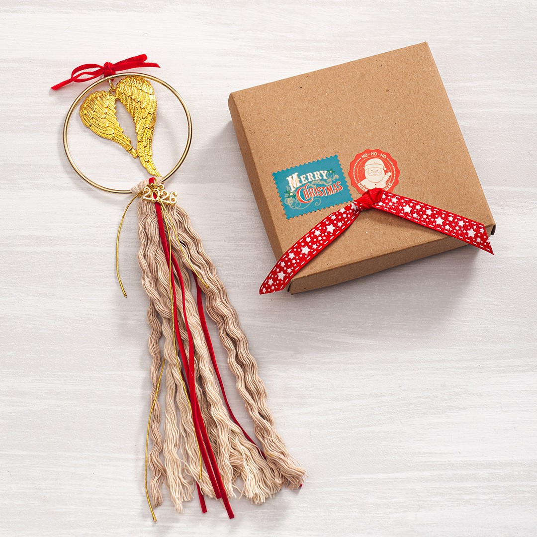 Χριστουγεννιάτικο κρεμαστό γούρι με μεταλλικό χρυσά φτερά σε κρίκο .Είναι στολισμένο με κορδόνι εκρού και βελούδινη κόκκινη κορδέλα. Το γούρι είναι τοποθετημένο σε χάρτινο κουτί craft.