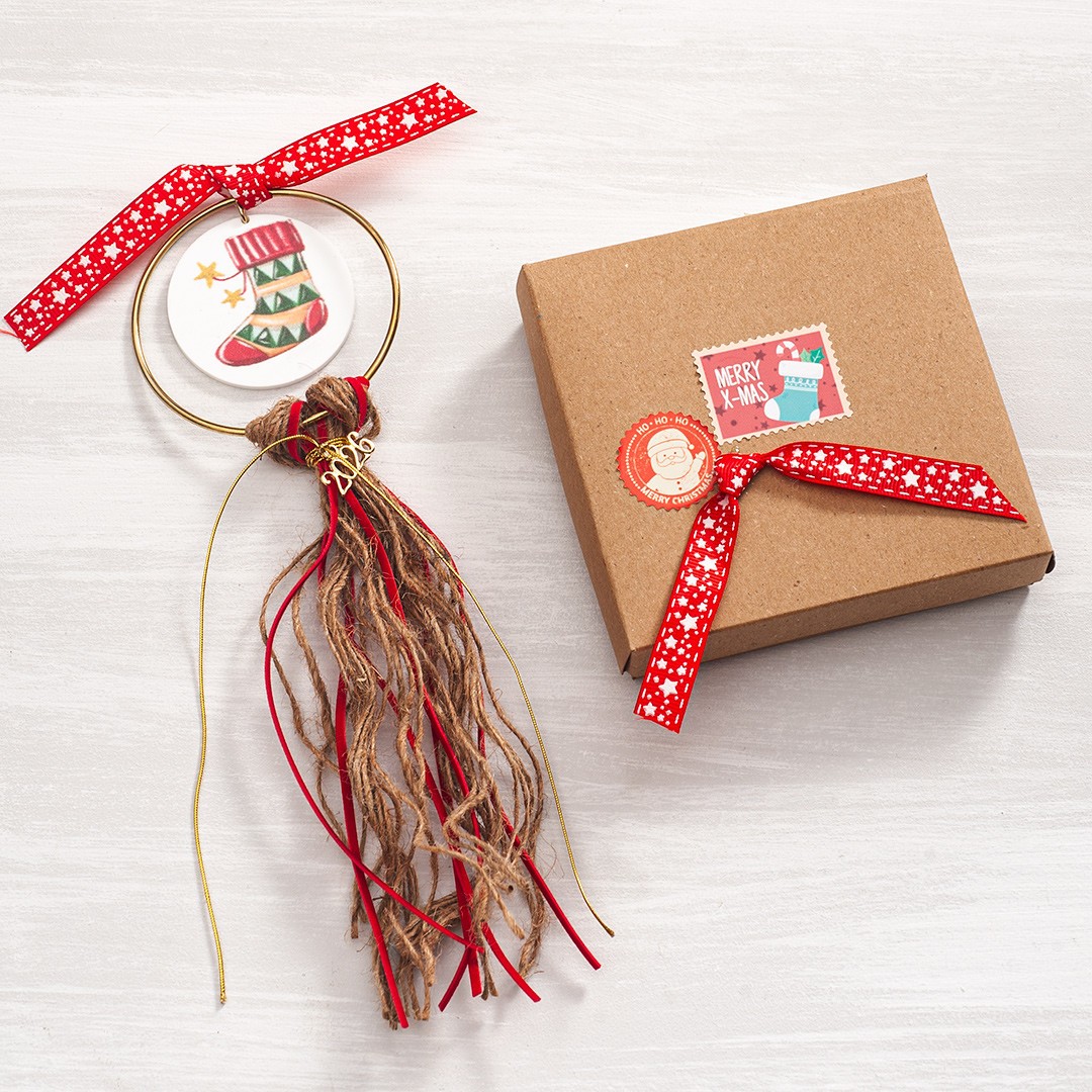 Χριστουγεννιάτικο κρεμαστό γούρι με plexiglass εκτύπωση κάλτσα σε μεταλλικό χρυσό κρίκο .Το γούρι είναι στολισμένο με σπάγγο σε φυσικό χρώμα και βελούδινη κόκκινη κορδέλα. Είναι τοποθετημένο σε χάρτινο κουτί craft.