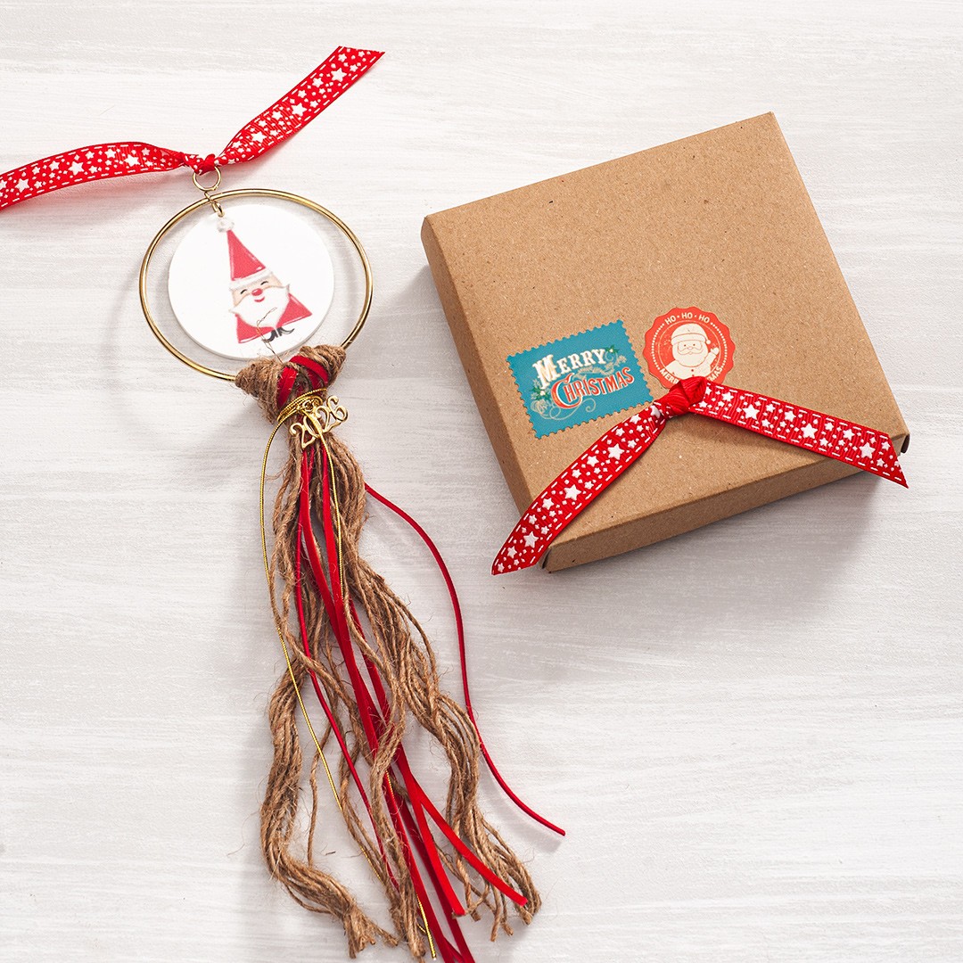 Χριστουγεννιάτικο κρεμαστό γούρι με plexiglass εκτύπωση Άγιο Βασίλη σε μεταλλικό χρυσό κρίκο .Το γούρι είναι στολισμένο με σπάγγο σε φυσικό χρώμα και κόκκινες κορδέλες. Είναι τοποθετημένο σε χάρτινο κουτί craft.