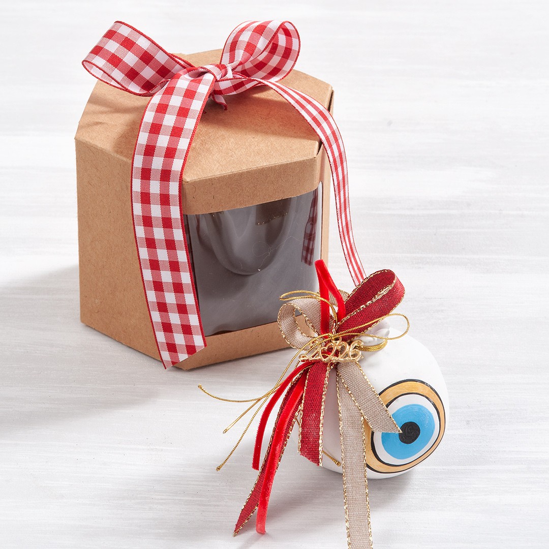 Χριστουγεννιάτικο γούρι γύψινο λευκό ρόδι. Είναι ζωγραφιστό με μάτι σε σιελ και χρυσές αποχρώσεις. Στην τιμή περιλαμβάνεται το χάρτινο κουτί δώρου που είναι τοποθετημένο το γούρι και η ετικέτα αποστολής.