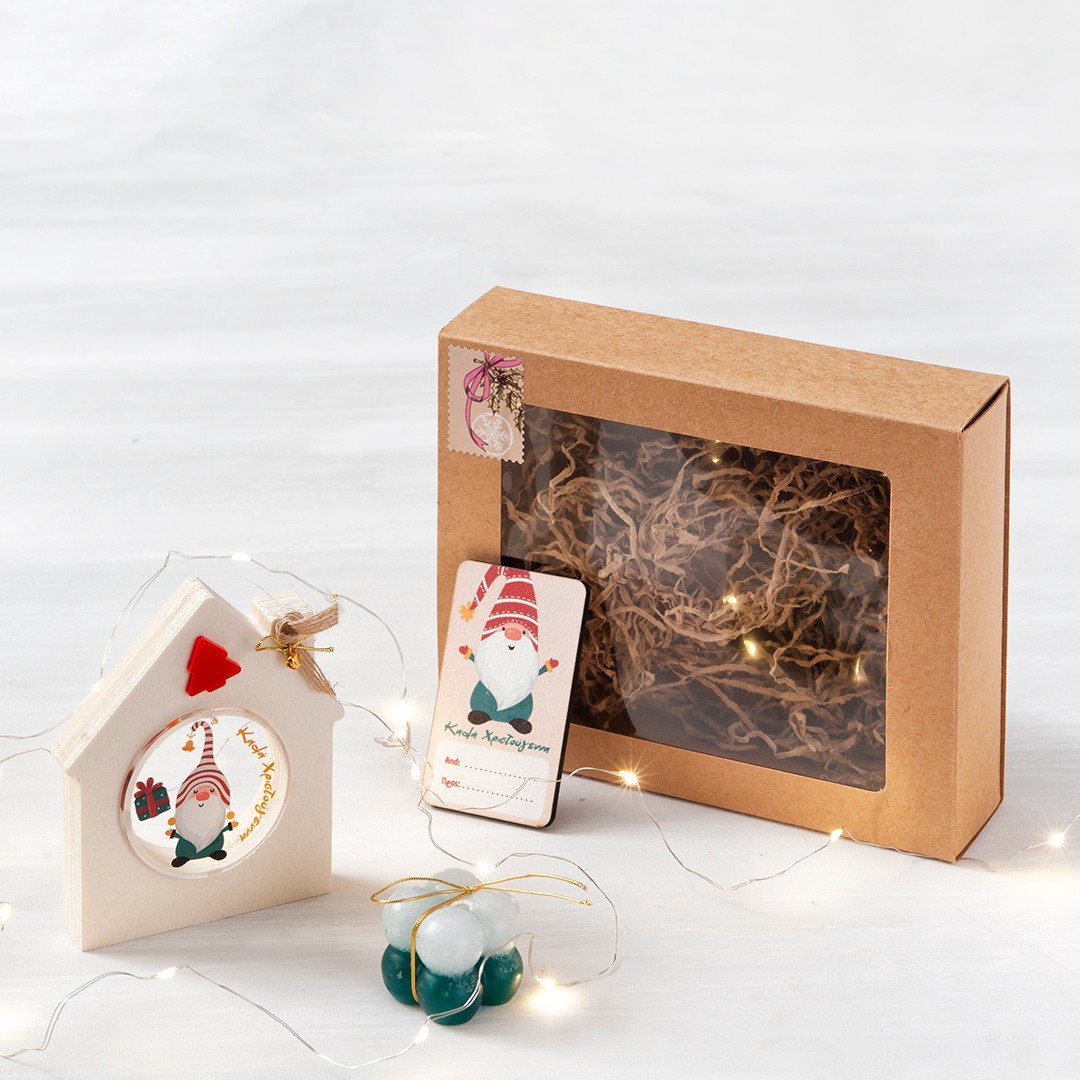 Χριστουγεννιάτικο σετ δώρου σε χάρτινο κουτί με θέμα το ξωτικό των Χριστουγέννων. Περιλαμβάνει α) ξύλινο διακοσμητικό σπιτάκι με plexiglass παράσταση β) αρωματικό κεράκι bubble γ) ξύλινη Χριστουγεννιάτικη ετικέτα αποστολής.