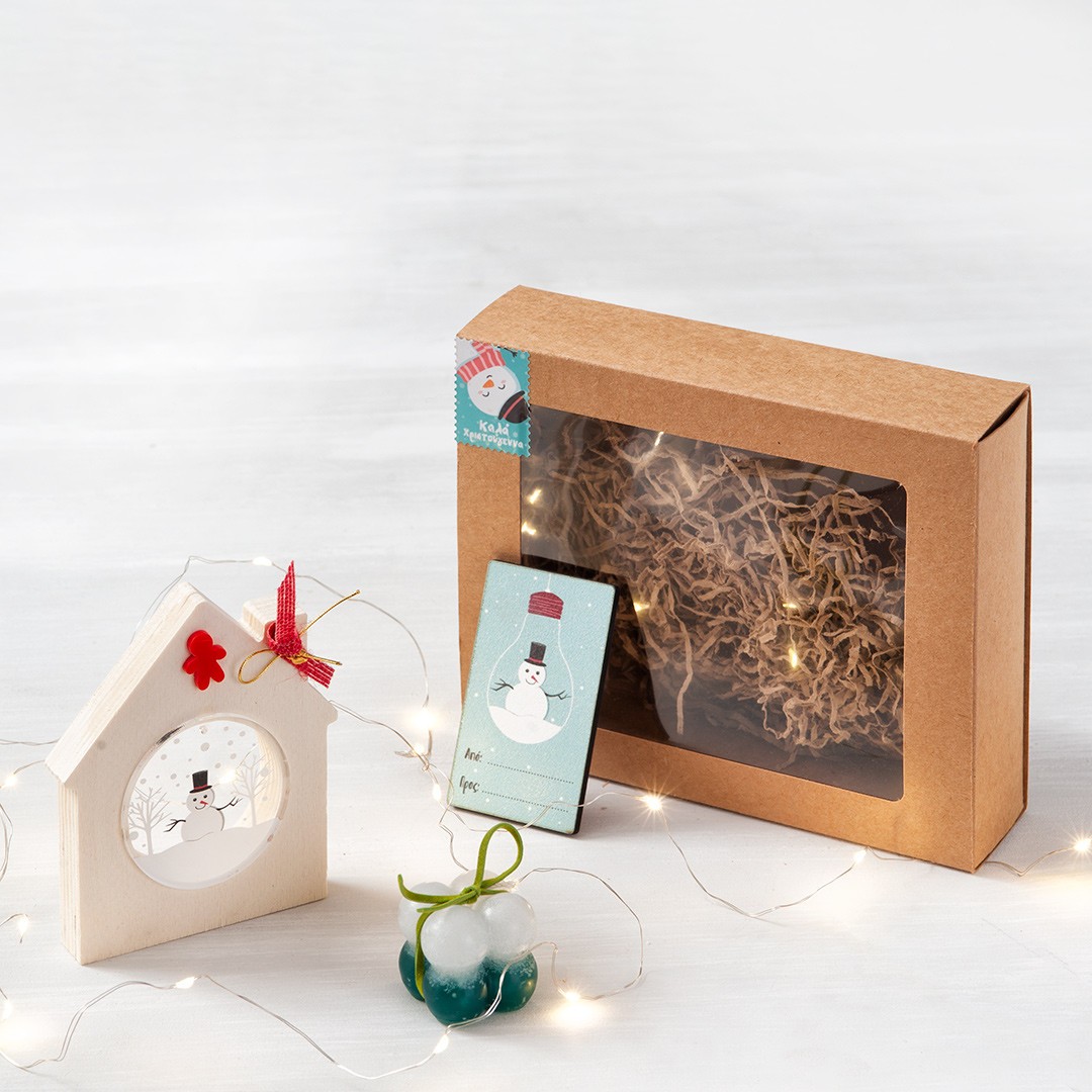 Χριστουγεννιάτικο σετ δώρου σε χάρτινο κουτί με θέμα χιονάνθρωπο. Περιλαμβάνει α) ξύλινο διακοσμητικό σπιτάκι με plexiglass παράσταση β) αρωματικό κεράκι bubble γ) ξύλινη Χριστουγεννιάτικη ετικέτα αποστολής.