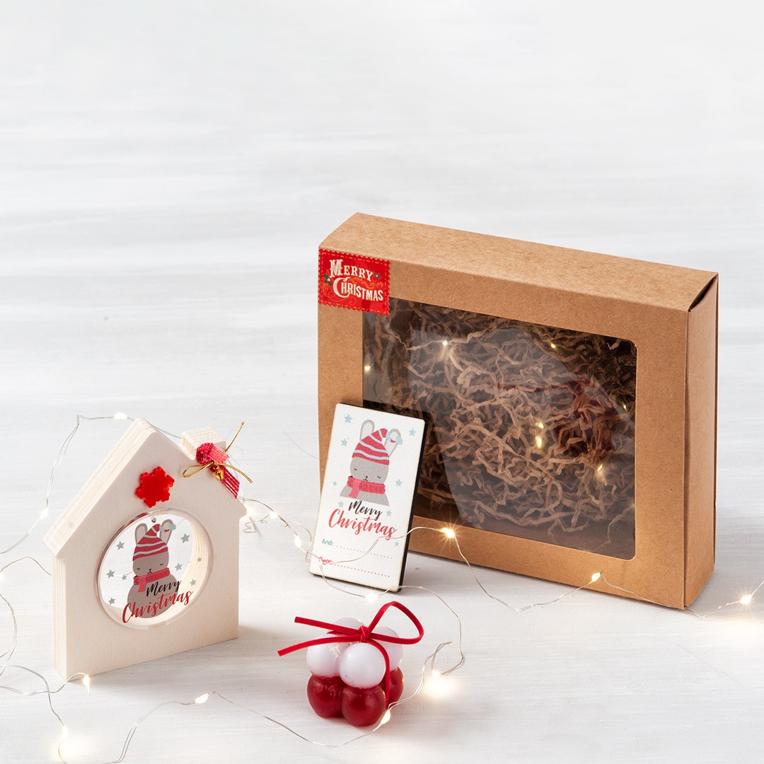 Χριστουγεννιάτικο σετ δώρου σε χάρτινο κουτί με θέμα Μerry Christmas.Περιλαμβάνει α) ξύλινο διακοσμητικό σπιτάκι με plexiglass παράσταση β) αρωματικό κεράκι bubble γ) ξύλινη Χριστουγεννιάτικη ετικέτα αποστολής.