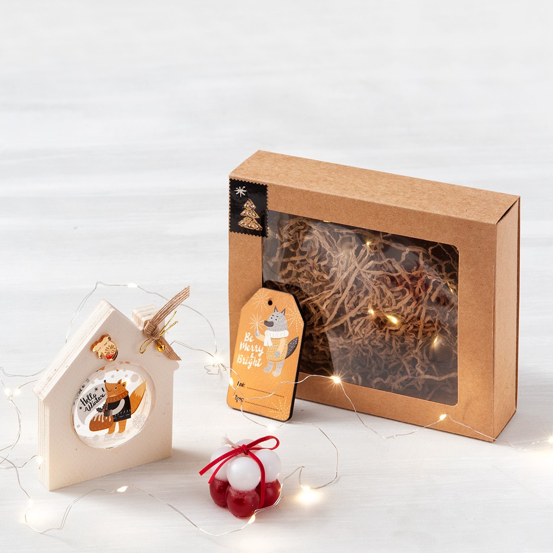 Χριστουγεννιάτικο σετ δώρου σε χάρτινο κουτί με θέμα Hello Winter.Περιλαμβάνει α) ξύλινο διακοσμητικό σπιτάκι με plexiglass παράσταση β) αρωματικό κεράκι bubble γ) ξύλινη Χριστουγεννιάτικη ετικέτα αποστολής.