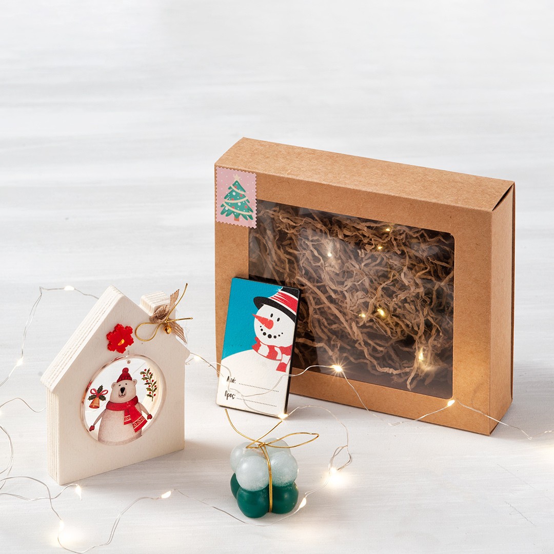 Χριστουγεννιάτικο σετ δώρου σε χάρτινο κουτί με θέμα το αρκουδάκι. Περιλαμβάνει α) ξύλινο διακοσμητικό σπιτάκι με plexiglass παράσταση β) αρωματικό κεράκι bubble γ) ξύλινη Χριστουγεννιάτικη ετικέτα αποστολής.