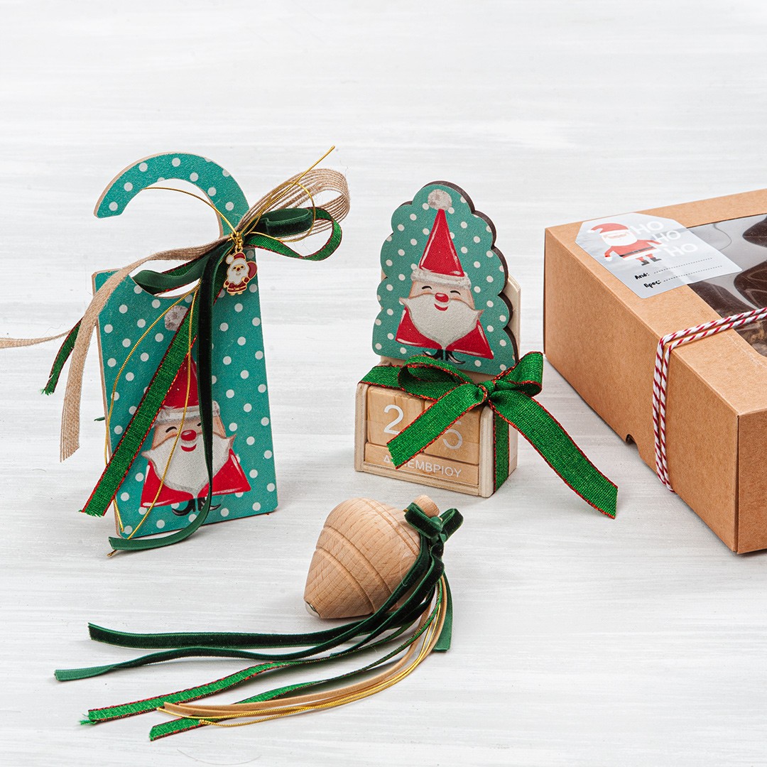 Χριστουγεννιάτικο σετ δώρου σε χάρτινο craft κουτί. Περιλαμβάνει τα παρακάτω ξύλινα δωράκια: περιλαμβάνει διακοσμητικό πόρτας, ημερολόγιο και σβούρα με θέμα τον Άγιο Βασίλη. Είναι όλα στολισμένα με κορδέλες και κορδόνια σε πράσινες αποχρώσεις.