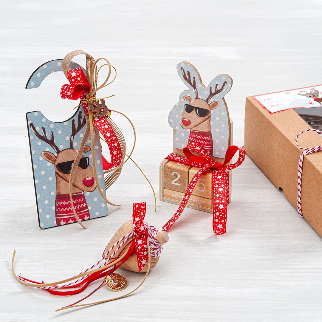 Χριστουγεννιάτικο σετ δώρου σε χάρτινο craft κουτί. Περιλαμβάνει τα παρακάτω ξύλινα δωράκια: διακοσμητικό πόρτας, ημερολόγιο και σβούρα με θέμα τον τάρανδο. Είναι όλα στολισμένα με κορδέλες σε κόκκινες αποχρώσεις.