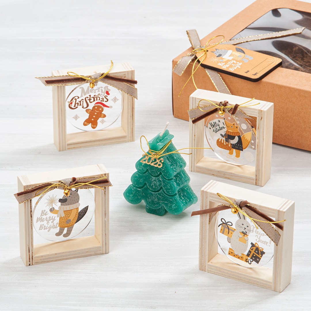 Χριστουγεννιάτικο σετ δώρου. Περιλαμβάνει τέσσερα ξύλινα καδράκια με Χριστουγεννιάτικες παραστάσεις σε διάφανο plexi.Το σετ δώρου ολοκληρώνει ένα αρωματικό κεράκι. Στην τιμή περιλαμβάνεται το χάρτινο κουτί δώρου και η ξύλινη ετικέτα αποστολής.