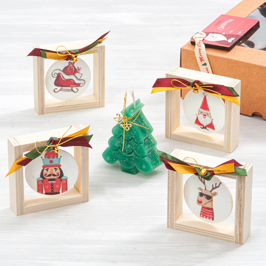 Χριστουγεννιάτικο σετ δώρου. Περιλαμβάνει τέσσερα ξύλινα καδράκια με Χριστουγεννιάτικες παραστάσεις σε λευκό plexi.Το σετ δώρου ολοκληρώνει ένα αρωματικό κεράκι. Στην τιμή περιλαμβάνεται το χάρτινο κουτί δώρου και η ξύλινη ετικέτα αποστολής.