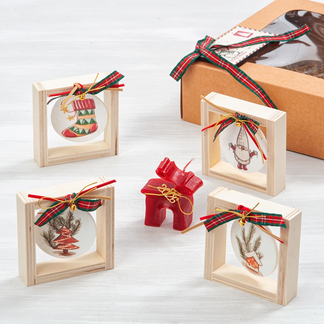Χριστουγεννιάτικο σετ δώρου. Περιλαμβάνει τέσσερα ξύλινα καδράκια με Χριστουγεννιάτικες παραστάσεις σε λευκό plexi.Το σετ δώρου ολοκληρώνει ένα αρωματικό κεράκι. Στην τιμή περιλαμβάνεται το χάρτινο κουτί δώρου και η ξύλινη ετικέτα αποστολής.