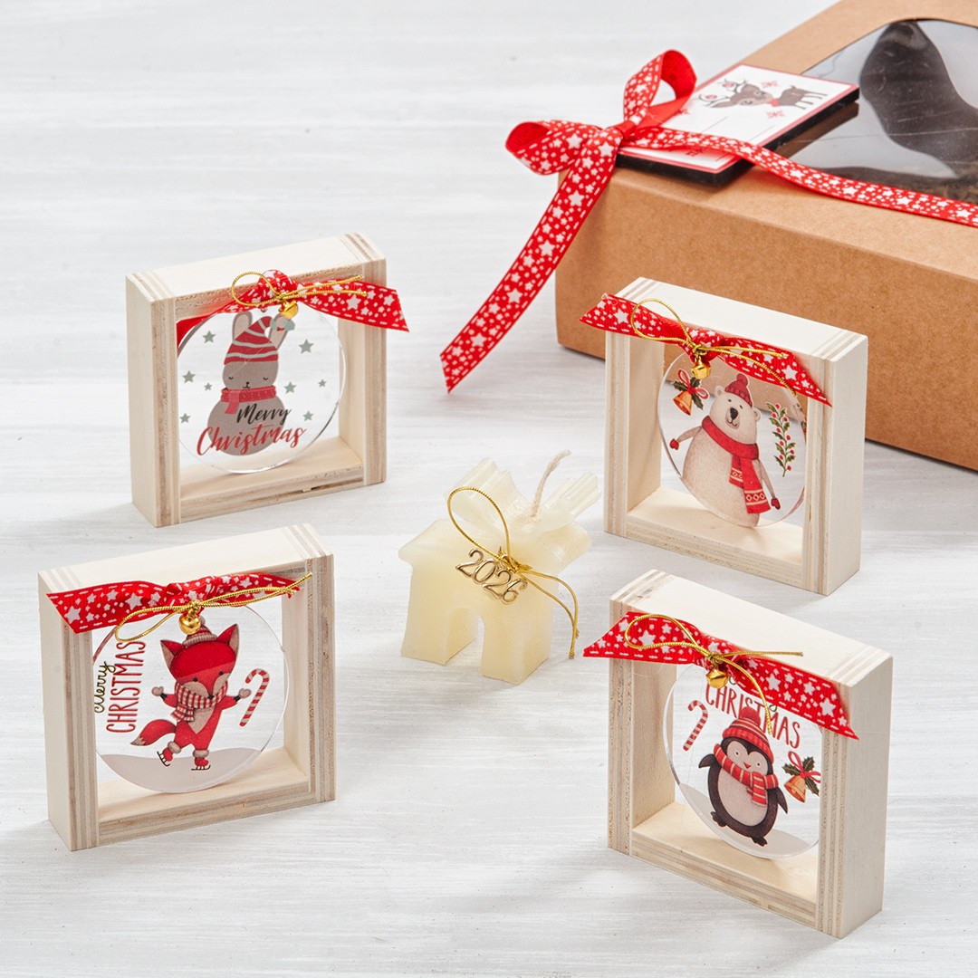 Χριστουγεννιάτικο σετ δώρου. Περιλαμβάνει τέσσερα ξύλινα καδράκια με Χριστουγεννιάτικες παραστάσεις σε διάφανο plexi.Το σετ δώρου ολοκληρώνει ένα αρωματικό κεράκι. Στην τιμή περιλαμβάνεται το χάρτινο κουτί δώρου και η ξύλινη ετικέτα αποστολής.