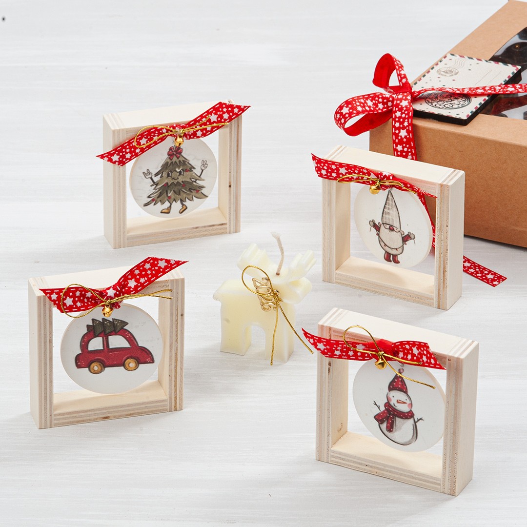 Χριστουγεννιάτικο σετ δώρου. Περιλαμβάνει τέσσερα ξύλινα καδράκια με Χριστουγεννιάτικες παραστάσεις σε λευκό plexi.Το σετ δώρου ολοκληρώνει ένα αρωματικό κεράκι. Στην τιμή περιλαμβάνεται το χάρτινο κουτί δώρου και η ξύλινη ετικέτα αποστολής.