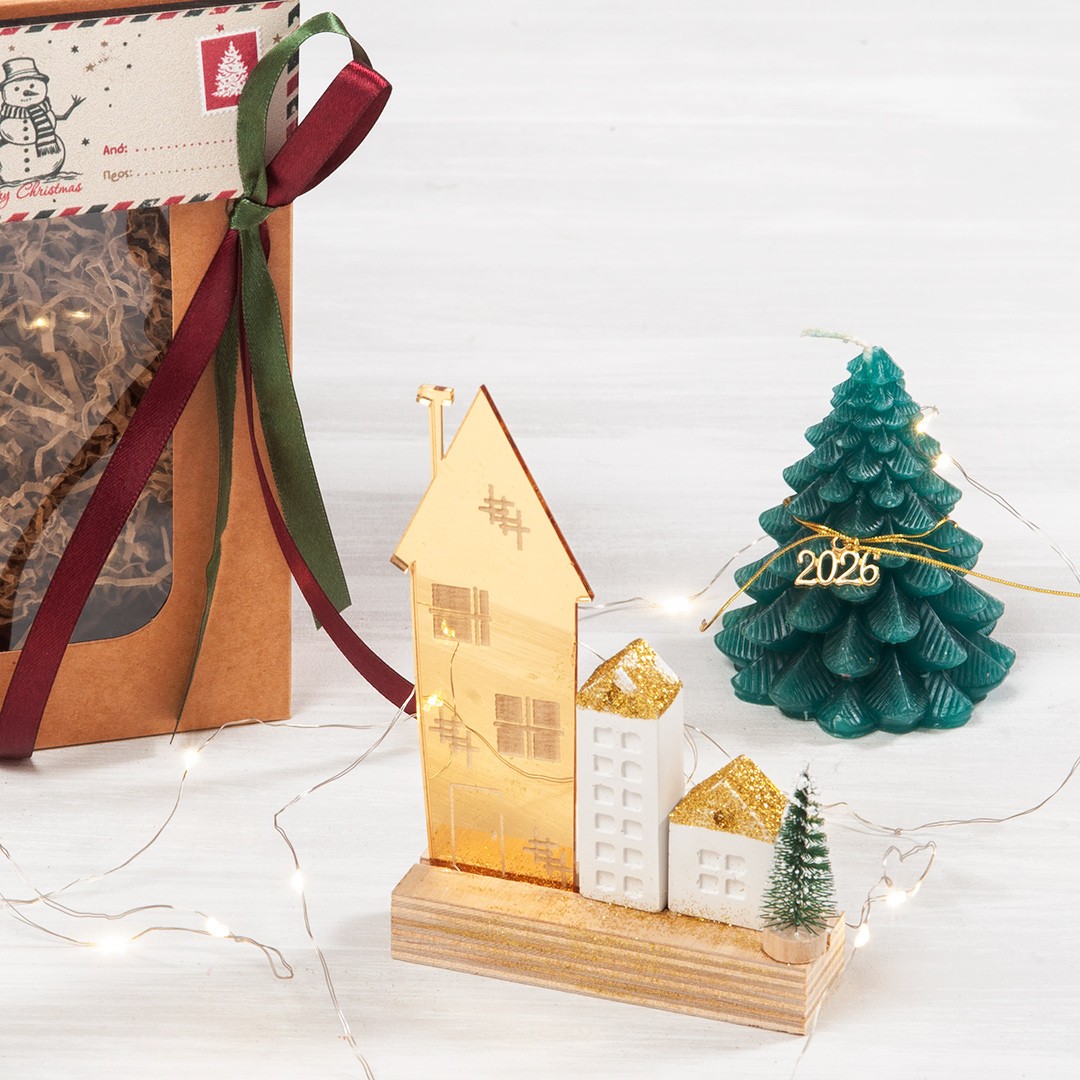 Χριστουγεννιάτικο σετ δώρου. Το δώρο αποτελείται από plexiglass κοπτικό χρυσό καθρέπτη σε ξύλινη βάση,Χριστουγεννιάτικο αρωματικό κερί, γύψινο σπιτάκι και φωτάκια led.Στην τιμή περιλαμβάνεται το χάρτινο κουτί δώρου και η ξύλινη ετικέτα αποστολής.