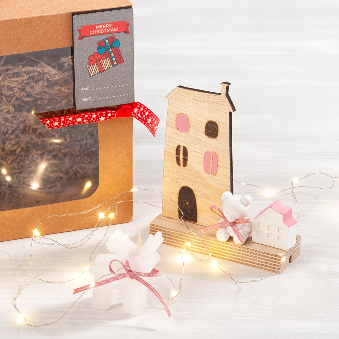Χριστουγεννιάτικο σετ δώρου. Το δώρο αποτελείται από ξύλινο κοπτικό σε βάση,Χριστουγεννιάτικο αρωματικό κερί ,γύψινο σπιτάκι και αρκουδάκι,φωτάκια led.Στην τιμή περιλαμβάνεται το χάρτινο κουτί δώρου και η ξύλινη ετικέτα αποστολής.
