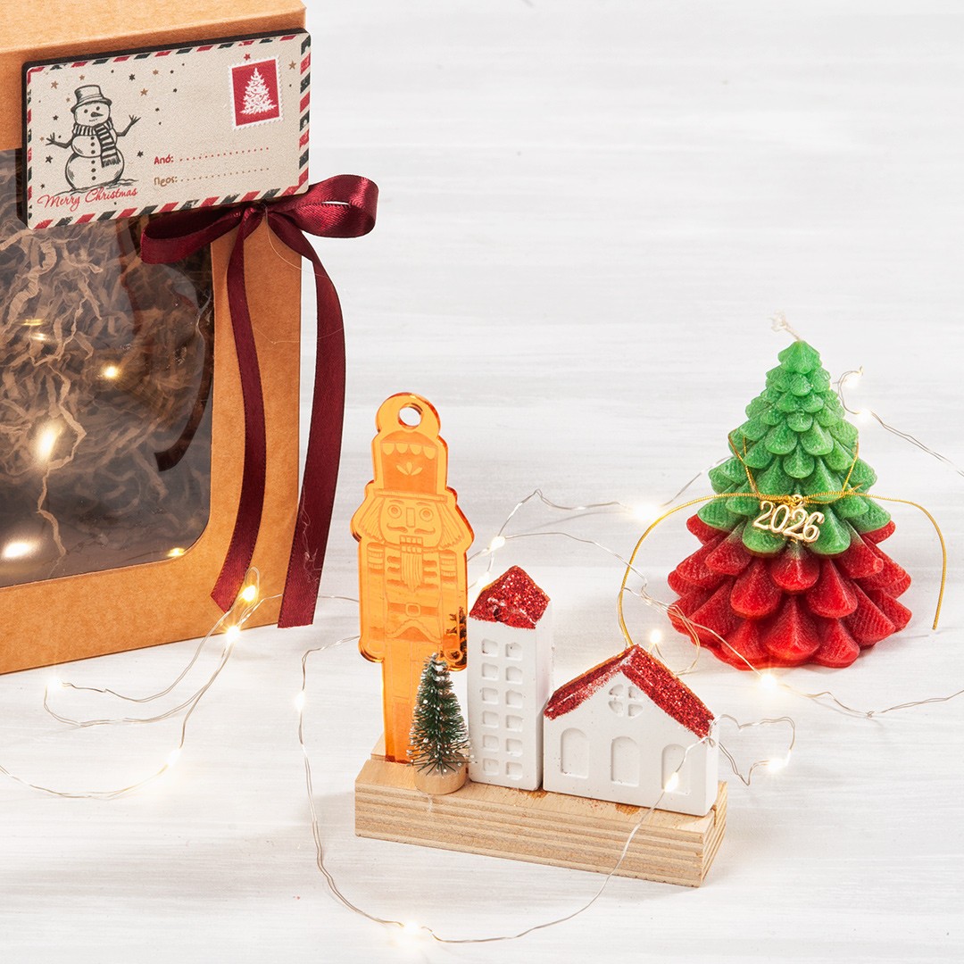 Χριστουγεννιάτικο σετ δώρου. Το δώρο αποτελείται από plexiglass κοπτικό rose gold καθρέπτη σε ξύλινη βάση,Χριστουγεννιάτικο αρωματικό κερί, γύψινα σπιτάκια και φωτάκια led.Στην τιμή περιλαμβάνεται το χάρτινο κουτί δώρου και η ξύλινη ετικέτα αποστολής.