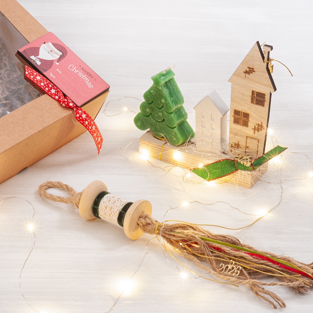 Χριστουγεννιάτικο σετ δώρου. Το δώρο αποτελείται από ξύλινο κοπτικό σε βάση,Χριστουγεννιάτικο αρωματικό κερί ,γύψινο σπιτάκι, φωτάκια led και στολισμένη κουβαρίστρα. Στην τιμή περιλαμβάνεται το χάρτινο κουτί δώρου και η ξύλινη ετικέτα αποστολής.