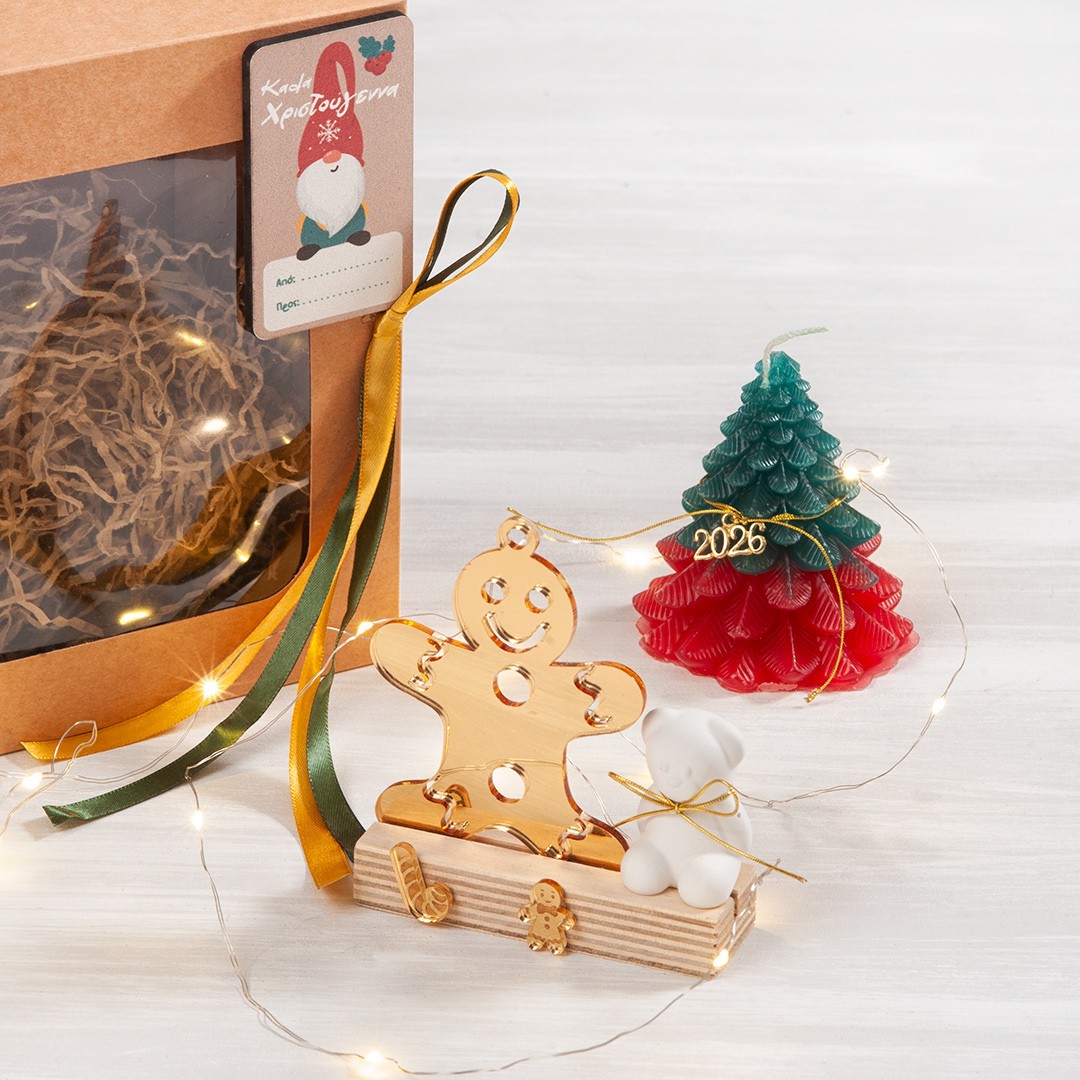 Χριστουγεννιάτικο σετ δώρου. Το δώρο αποτελείται από plexiglass κοπτικό χρυσό καθρέπτη σε ξύλινη βάση,Χριστουγεννιάτικο αρωματικό κερί, γύψινο αρκουδάκι και φωτάκια led.Στην τιμή περιλαμβάνεται το χάρτινο κουτί δώρου και η ξύλινη ετικέτα αποστολής.