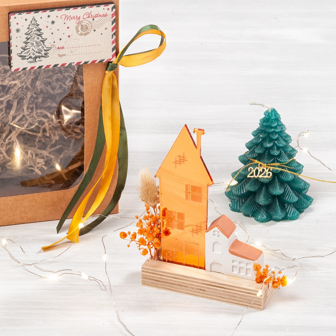 Χριστουγεννιάτικο σετ δώρου. Το δώρο αποτελείται από plexiglass κοπτικό rose gold καθρέπτη σε ξύλινη βάση,Χριστουγεννιάτικο αρωματικό κερί, γύψινο σπιτάκι και φωτάκια led.Στην τιμή περιλαμβάνεται το χάρτινο κουτί δώρου και η ξύλινη ετικέτα αποστολής.