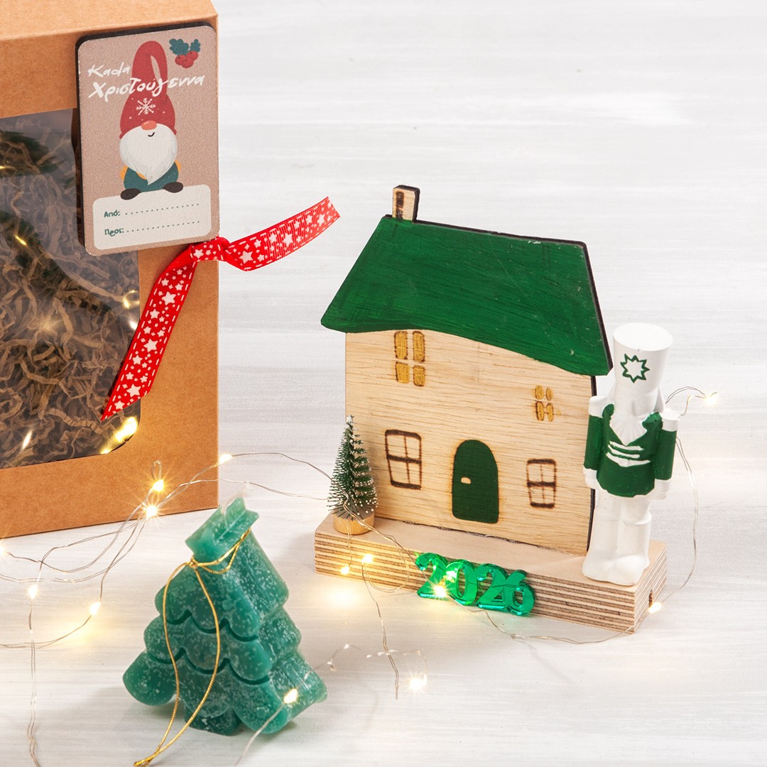 Χριστουγεννιάτικο σετ δώρου. Το δώρο αποτελείται από ξύλινο κοπτικό σε βάση,Χριστουγεννιάτικο αρωματικό κερί ,γύψινο καρυοθραύστη και φωτάκια led.Στην τιμή περιλαμβάνεται το χάρτινο κουτί δώρου και η ξύλινη ετικέτα αποστολής.