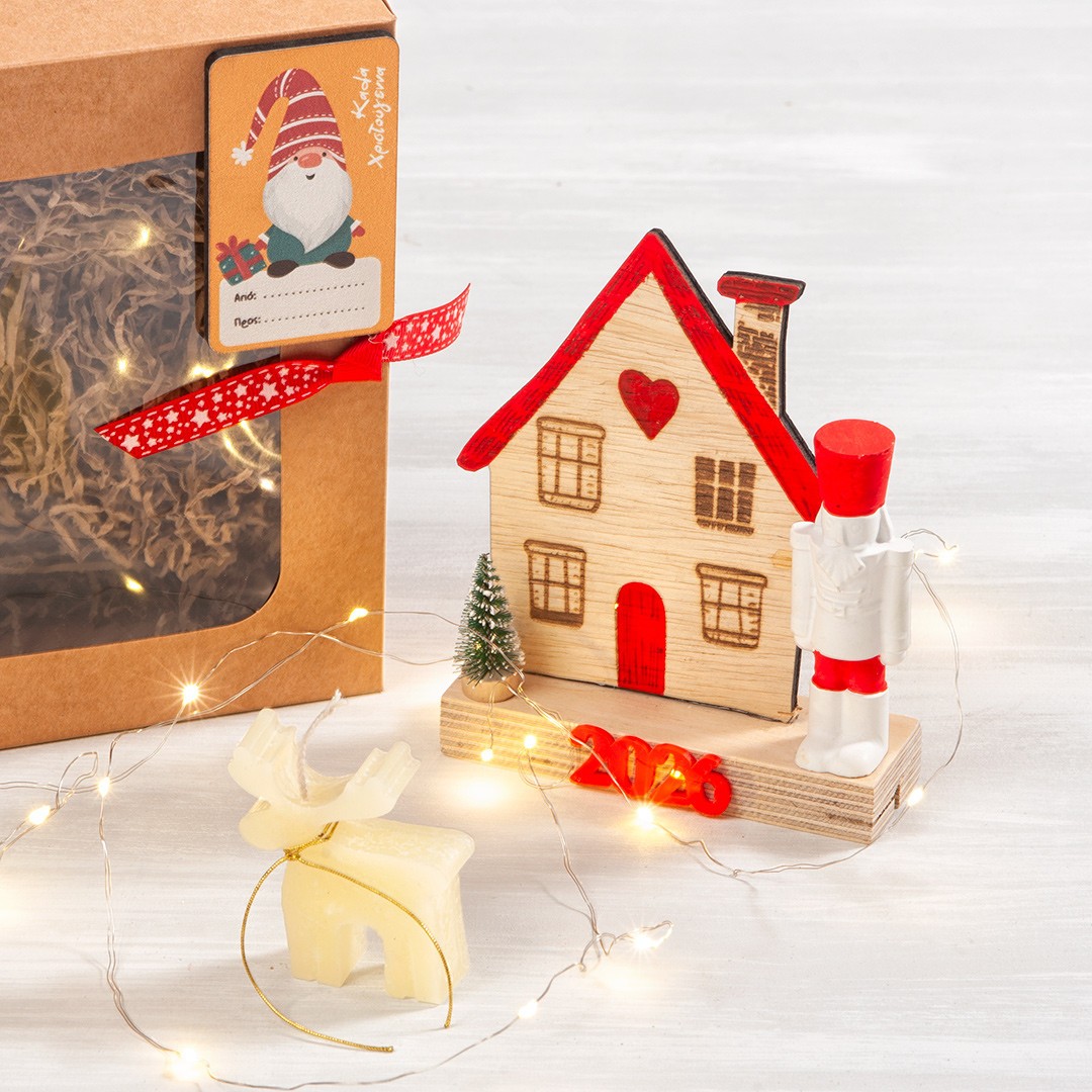 Χριστουγεννιάτικο σετ δώρου. Το δώρο αποτελείται από ξύλινο κοπτικό σε βάση,Χριστουγεννιάτικο αρωματικό κερί ,γύψινο καρυοθραύστη και φωτάκια led.Στην τιμή περιλαμβάνεται το χάρτινο κουτί δώρου και η ξύλινη ετικέτα αποστολής.