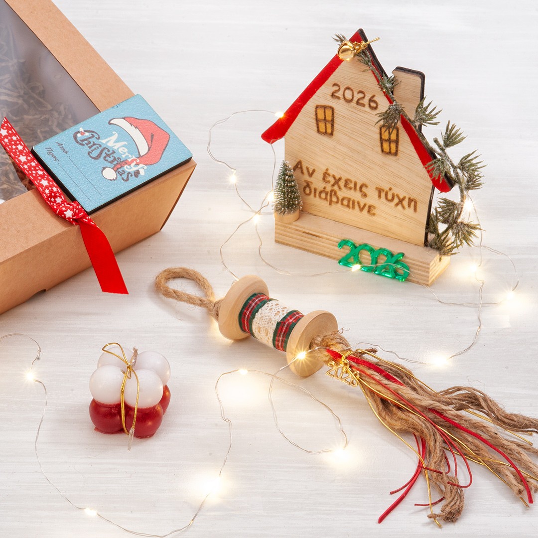 Χριστουγεννιάτικο σετ δώρου. Το δώρο αποτελείται από ξύλινο κοπτικό σε βάση, αρωματικό κερί, φωτάκια led και στολισμένη κουβαρίστρα. Στην τιμή περιλαμβάνεται το χάρτινο κουτί δώρου και η ξύλινη ετικέτα αποστολής.