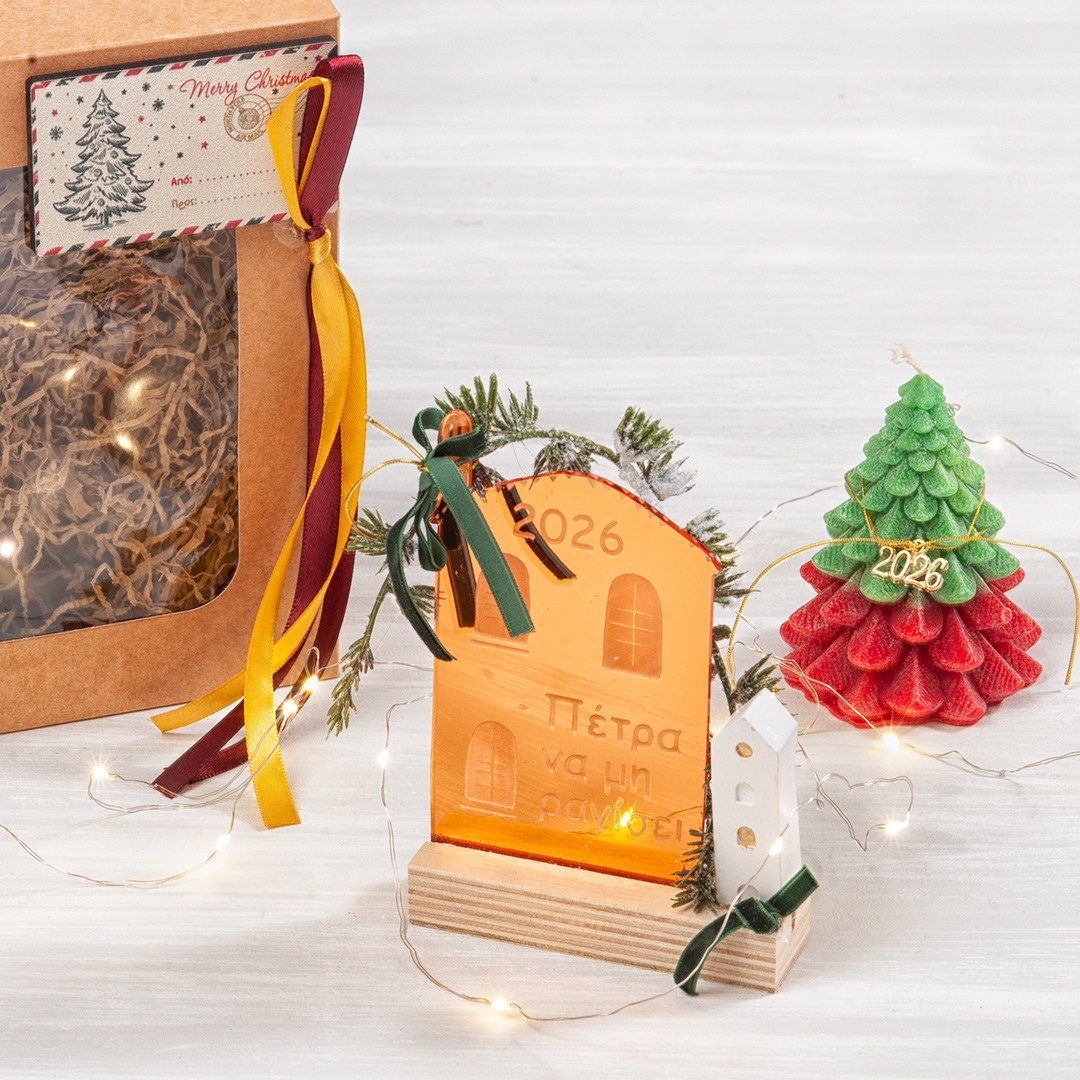 Χριστουγεννιάτικο σετ δώρου. Το δώρο αποτελείται από plexiglass κοπτικό rose gold καθρέπτη σε ξύλινη βάση,Χριστουγεννιάτικο αρωματικό κερί, γύψινο σπιτάκι και φωτάκια led.Στην τιμή περιλαμβάνεται το χάρτινο κουτί δώρου και η ξύλινη ετικέτα αποστολής.