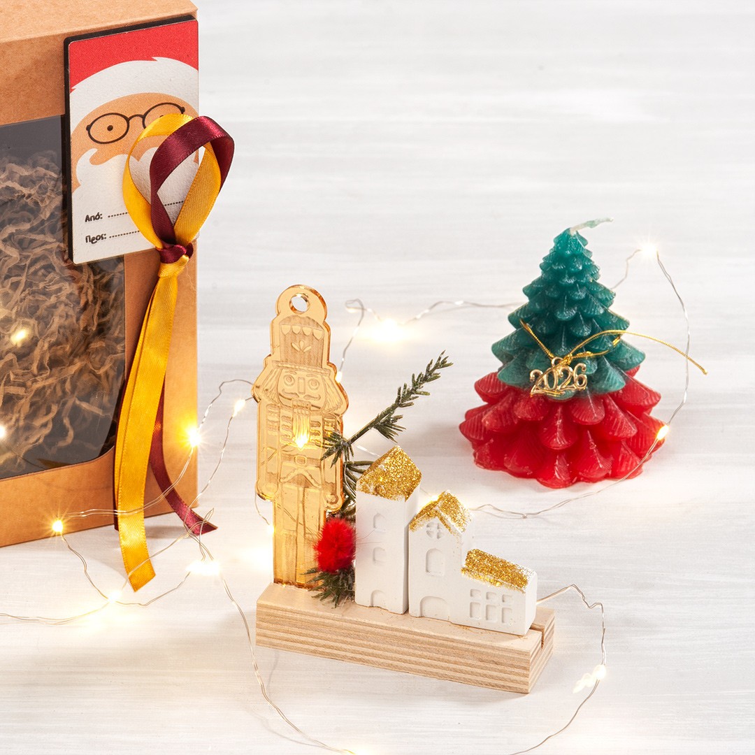 Χριστουγεννιάτικο σετ δώρου. Το δώρο αποτελείται από plexiglass κοπτικό χρυσό καθρέπτη σε ξύλινη βάση,Χριστουγεννιάτικο αρωματικό κερί, γύψινα σπιτάκια και φωτάκια led.Στην τιμή περιλαμβάνεται το χάρτινο κουτί δώρου και η ξύλινη ετικέτα αποστολής.