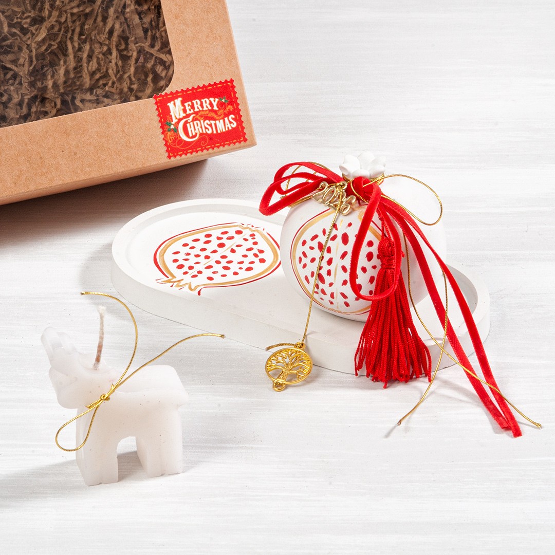 Χριστουγεννιάτικο σετ δώρου. Το δώρο αποτελείται από : αρωματικό κερί, γύψινο ζωγραφιστό ρόδι και ζωγραφιστό οβάλ πιατάκι. Στην τιμή περιλαμβάνεται το χάρτινο κουτί δώρου.