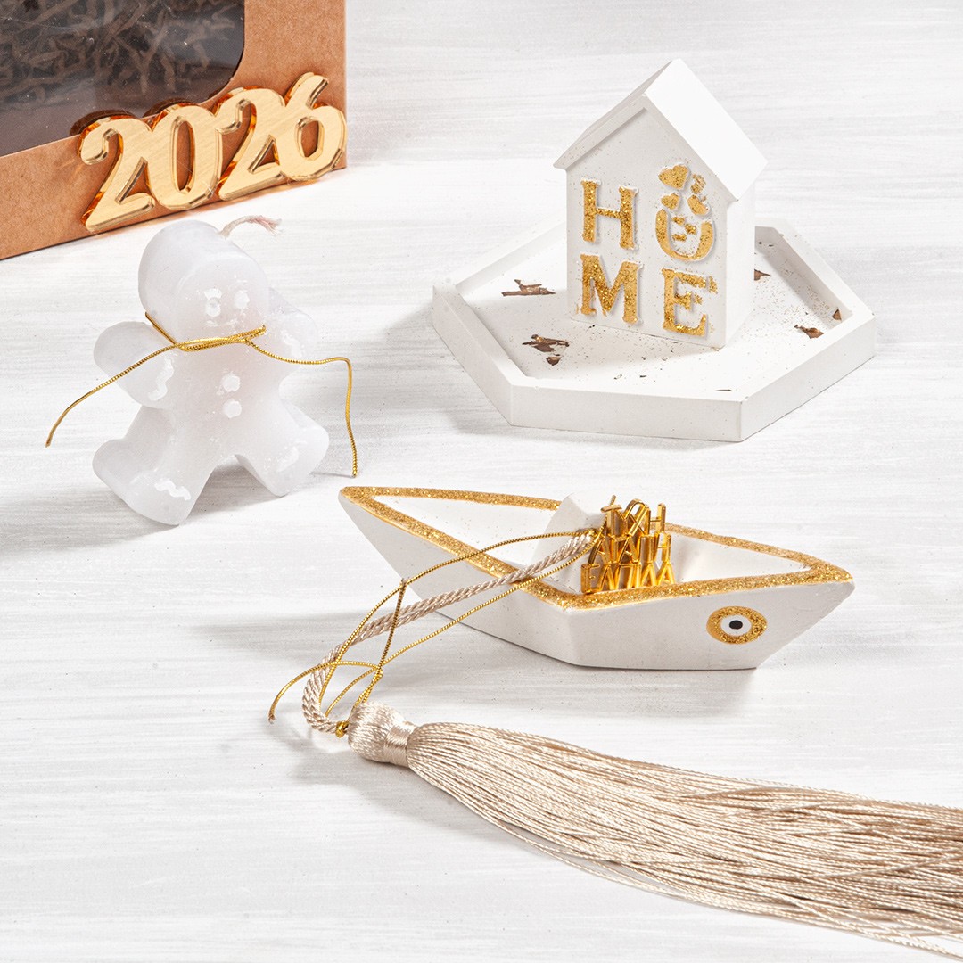 Χριστουγεννιάτικο σετ δώρου. Το δώρο αποτελείται από : αρωματικό κερί, γύψινο καραβάκι, σπιτάκι και πολύγωνο πιατάκι. Στην τιμή περιλαμβάνεται το χάρτινο κουτί δώρου.