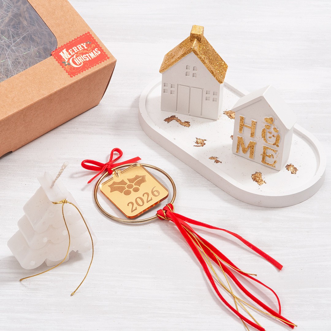 Χριστουγεννιάτικο σετ δώρου. Το δώρο αποτελείται από : αρωματικό κερί, γύψινα διακοσμητικά σπιτάκια και οβάλ πιατάκι,κρεμαστό γούρι με χρυσό plexiglass κοπτικό. Στην τιμή περιλαμβάνεται το χάρτινο κουτί δώρου.
