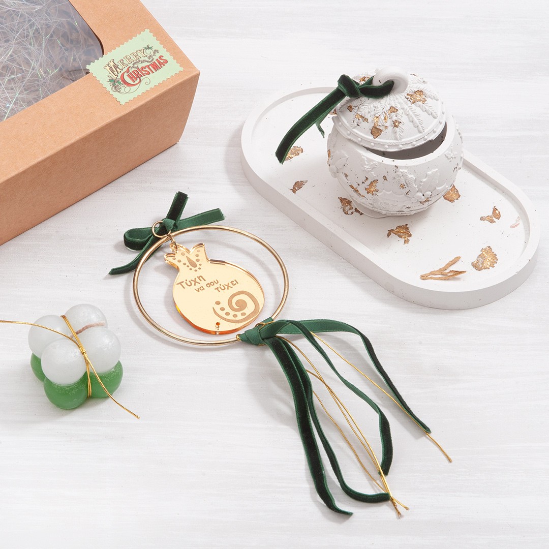 Χριστουγεννιάτικο σετ δώρου. Το δώρο αποτελείται από : αρωματικό κερί, γύψινη μπάλα μπιζουτιέρα και οβάλ πιατάκι,κρεμαστό γούρι με χρυσό plexiglass κοπτικό. Στην τιμή περιλαμβάνεται το χάρτινο κουτί δώρου.