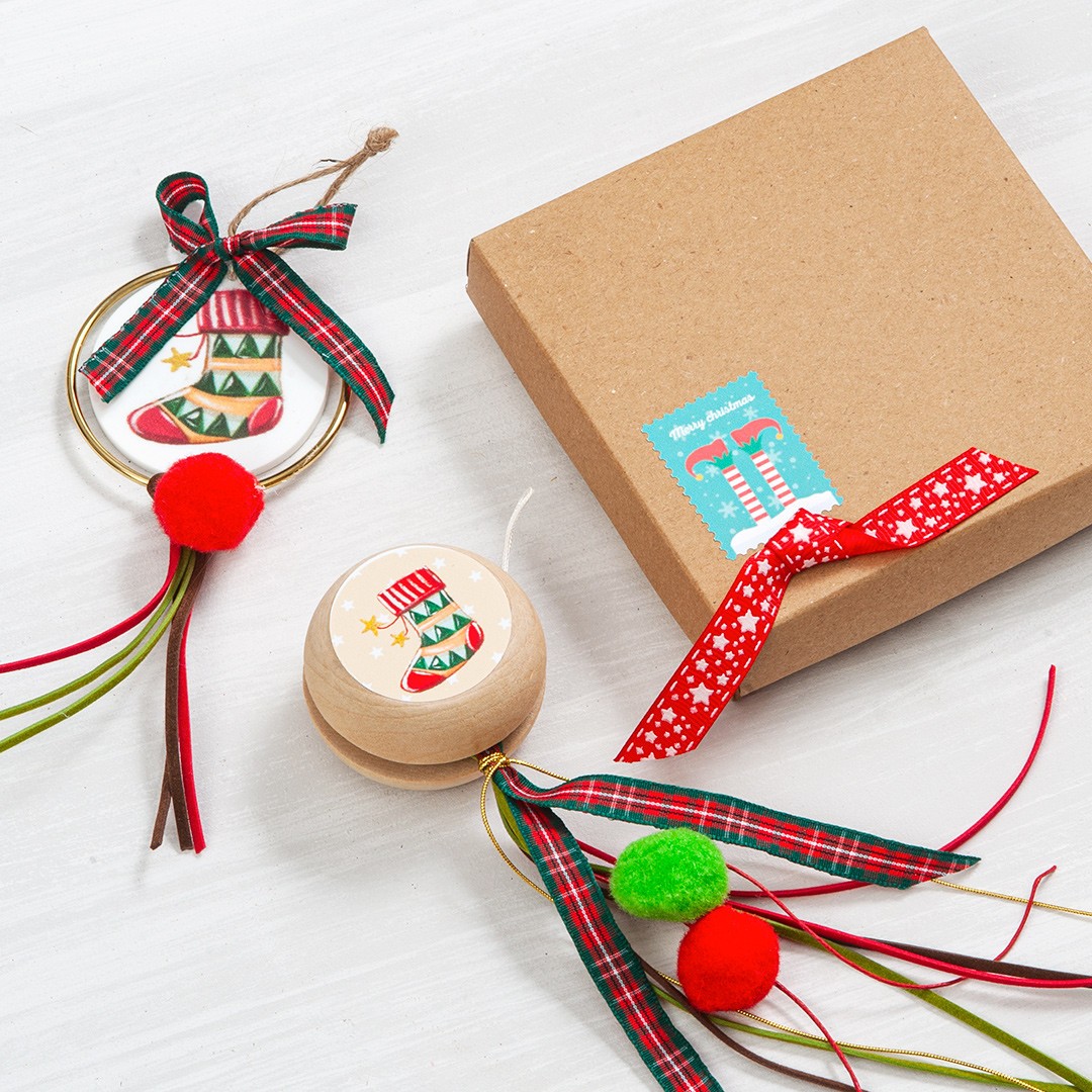 Χριστουγεννιάτικο σετ δώρου σε χάρτινο craft κουτί. Το δώρο έχει θέμα την Χριστουγεννιάτικη κάλτσα. Περιλαμβάνει ξύλινο yoyo και κρεμαστό γούρι με plexiglass παράσταση.