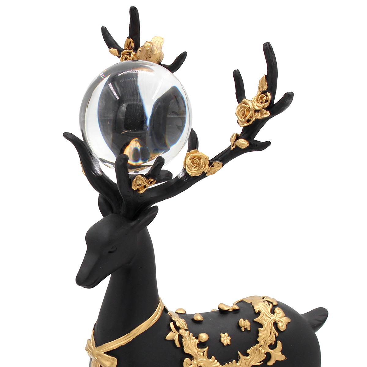 Αυτά τα διακοσμητικά ελάφια σε μαύρο και χρυσό με γυάλινες μπάλες ξεχωρίζουν για το στυλ τους. Κατασκευασμένα από polyresin με προσοχή στη λεπτομέρεια και κομψή λάμψη. Ιδανικά για κάθε γωνιά του σπιτιού, προσδίδουν πολυτέλεια και ζεστασιά.