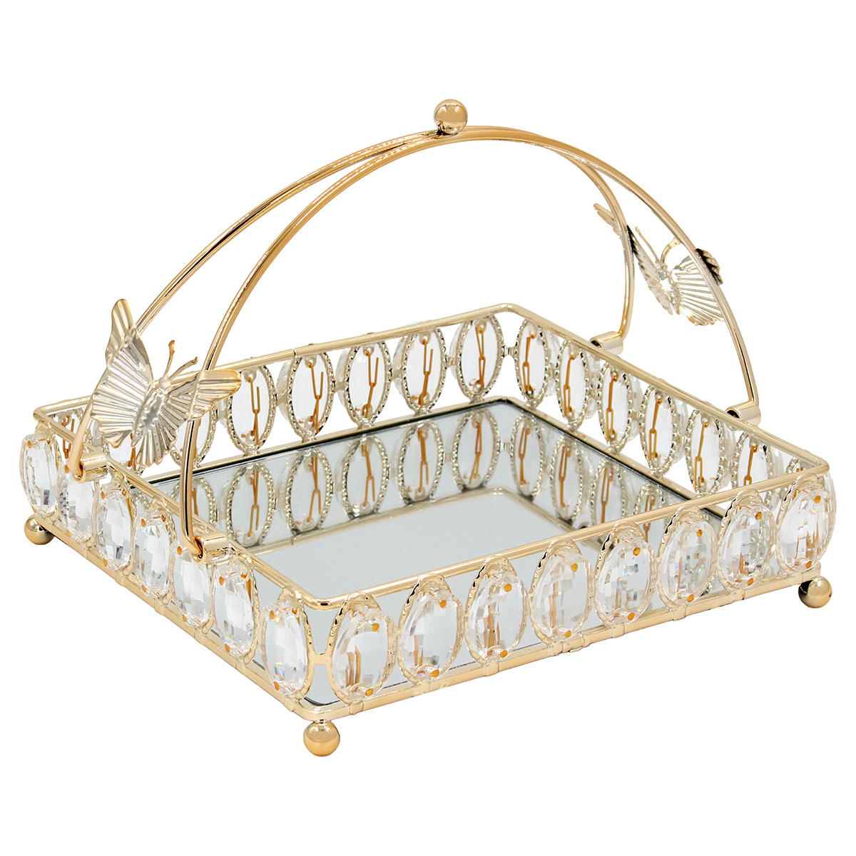 Διακοσμητικό - Δίσκος μεταλλικός με λαβή 24Χ21Χ18 εκ. Χρυσός με κρύσταλλα και καθρέπτη