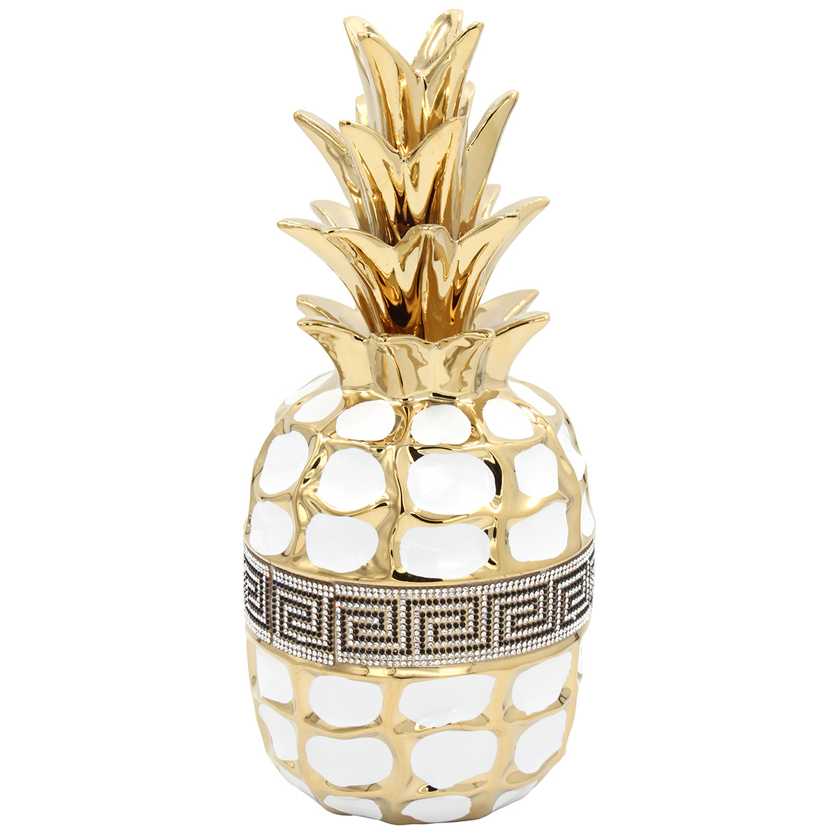 Αυτό το διακοσμητικό κεραμικό ανανάς έχει λευκή και χρυσή απόχρωση με strass. Εντυπωσιακή λεπτομέρεια σε κάθε μοντέρνο χώρο. Διαστάσεις Φ13Χ32 εκ. για κομψή παρουσία.