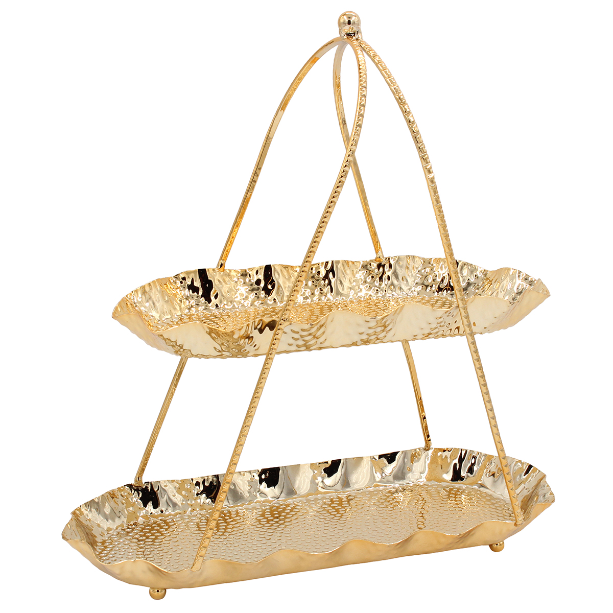 Αυτή η 2/όροφη μεταλλική πιατέλα, με διαστάσεις 30Χ12,5Χ31 εκ. και χρυσό χρώμα, είναι ιδανική για την παρουσίαση γλυκών, φρούτων ή άλλων εδεσμάτων. Ο πολυεπίπεδος σχεδιασμός της προσφέρει λειτουργικότητα και αισθητική, ενώ το χρυσό φινίρισμα προσδίδει μια αίσθηση πολυτέλειας και κομψότητας, κάνοντάς την κατάλληλη για κάθε περίσταση.