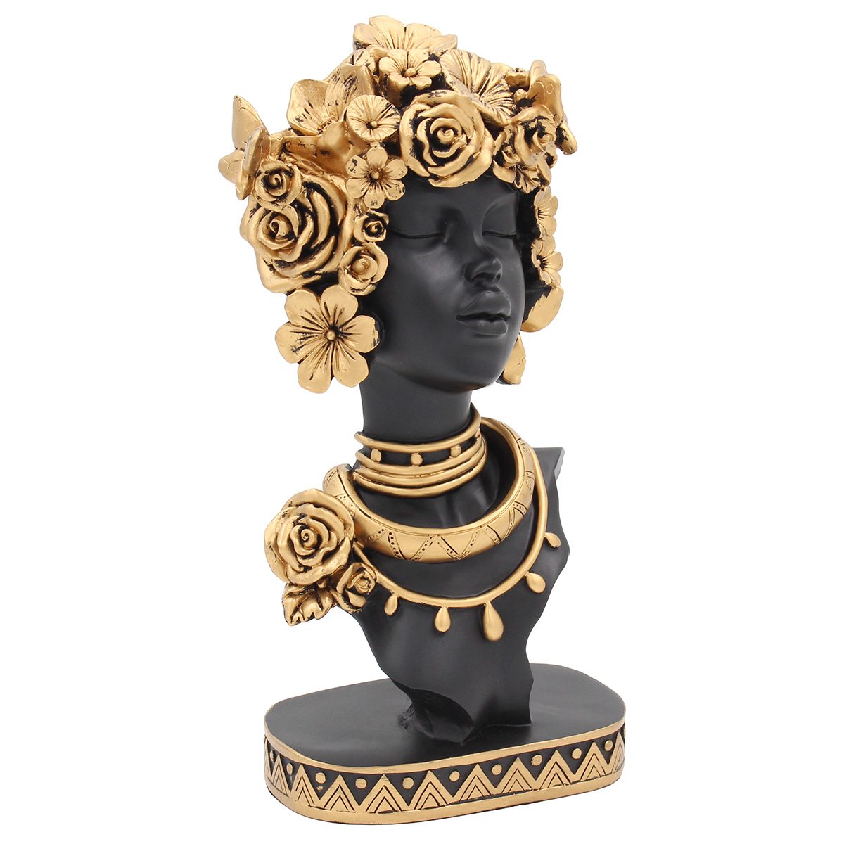 Αυτή η κομψή διακοσμητική γυναίκα σε μαύρο και χρυσό συνδυάζει δυναμισμό και φινέτσα. Με λεπτομέρειες που τραβούν το βλέμμα, προσθέτει πολυτέλεια στον χώρο. Ιδανική για ράφια, κονσόλες ή γραφεία.