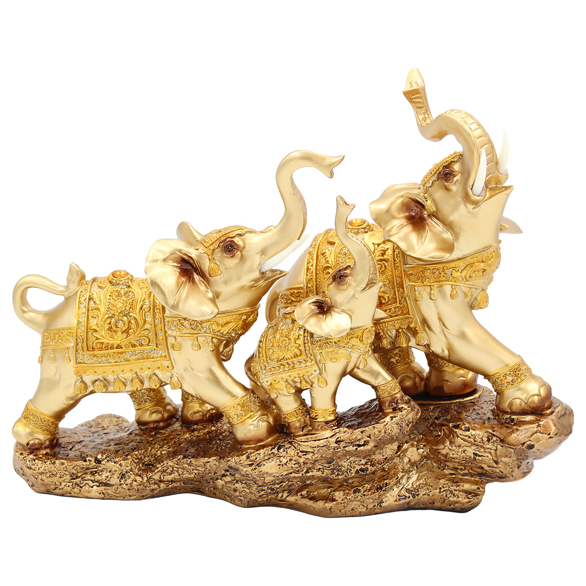 Αυτό το διακοσμητικό με χρυσούς-μπρονζέ ελέφαντες συνδυάζει ισχύ και αισθητική. Το μέγεθός του επιτρέπει κεντρική τοποθέτηση σε τραπέζι ή ράφι. Φέρνει τύχη και κομψότητα στον χώρο.