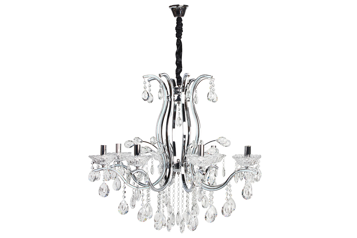 Φωτιστικό κρεμαστό 8 Χ Ε14 Φ76Χ65 εκ. χρώμιο με κρύσταλλα. Διαθέτει υφασμάτινο κάλυμμα στην αλυσίδα το οποίο μπορείτε να το αφαιρέσετε.