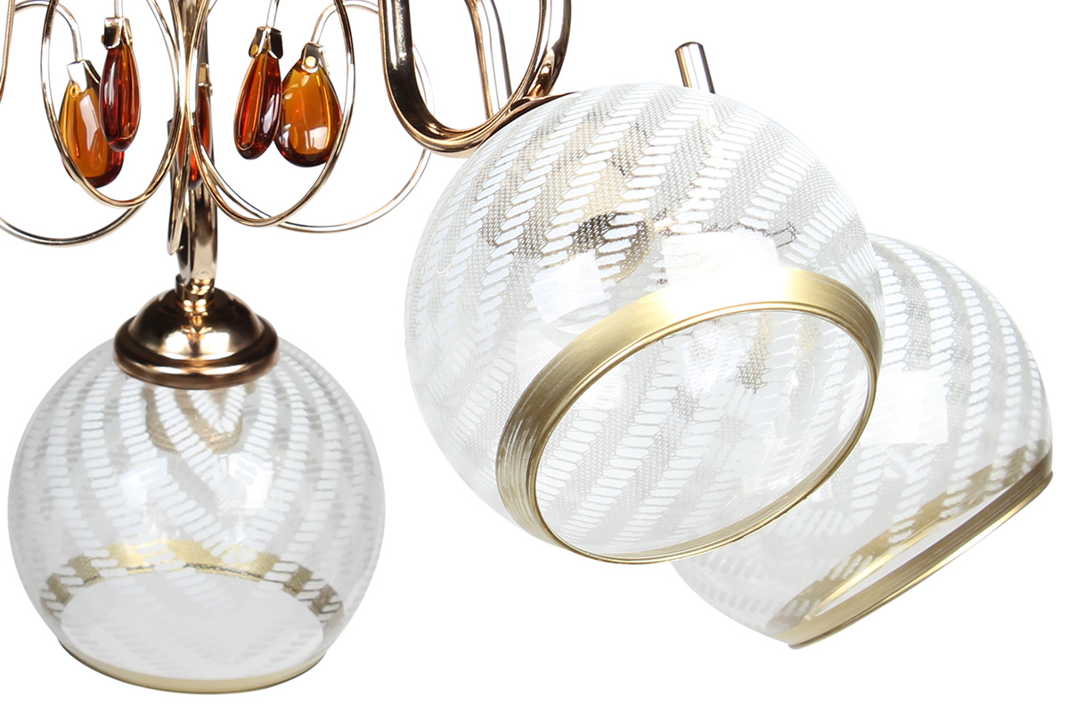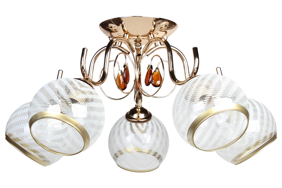 Φωτιστικό οροφής 5 Χ Ε27 Φ56Χ26 εκ. χρυσό με γυαλιά και μελί γυάλινα διακοσμητικά.