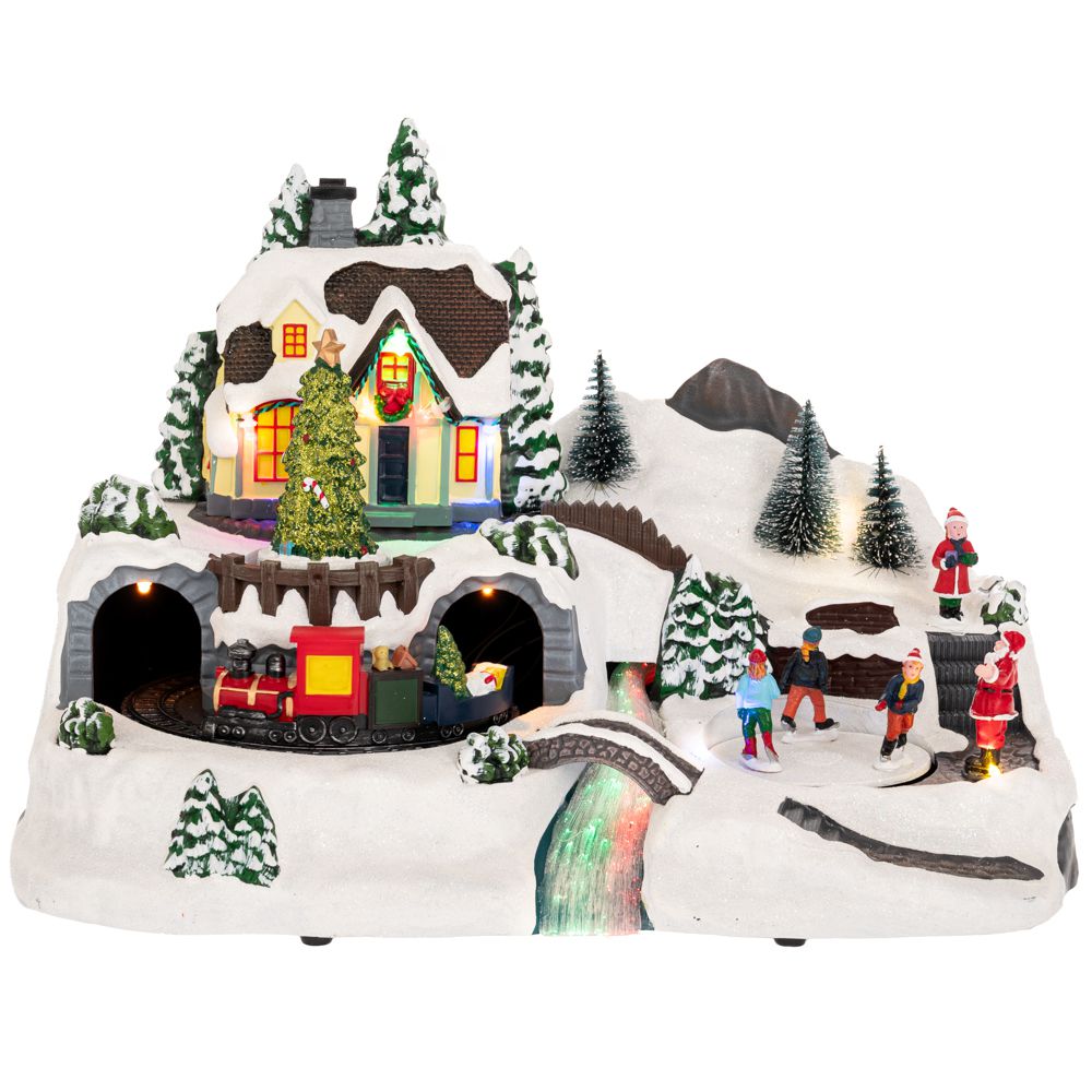 Χριστουγεννιάτικο εντυπωσιακό χωριό με φωτιζόμενο σπιτάκι, πίστα πατινάζ και τρενάκι που γυρνάει γύρω γύρω, μέσα σε τούνελ. Απεικονίζονται επίσης 3 παιδάκια που κινούνται και κάνουν πατινάζ. Εχει φως στο σπιτάκι καθώς και μουσική με 8 τραγούδια.