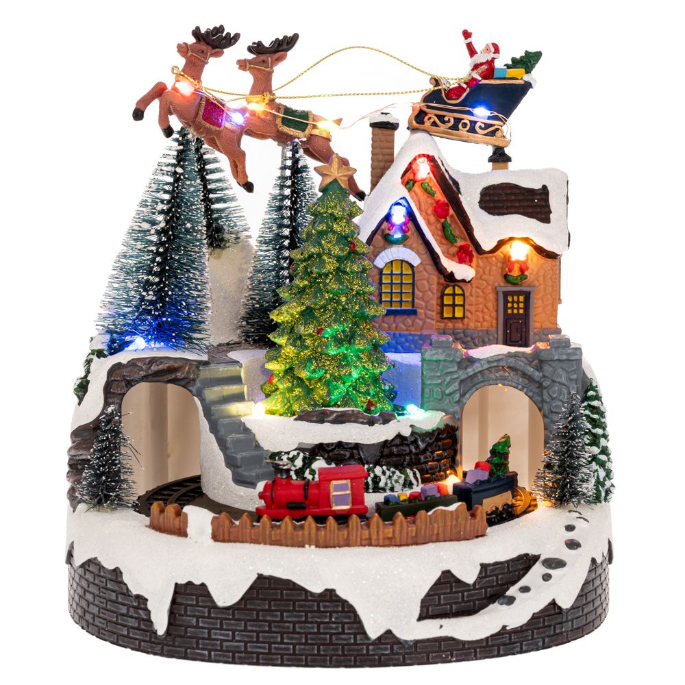 Χριστουγεννιάτικο φωτιζόμενο σκηνικό με τρενάκι που κινείται γύρω γύρω. Έχει ένα φωτιζόμενο σπιτάκι με χιονισμένα δέντρα και από πάνω είναι τοποθετημένος ο Άγιος Βασίλης μέσα στο έλκηθρο με τους ταράνδους.