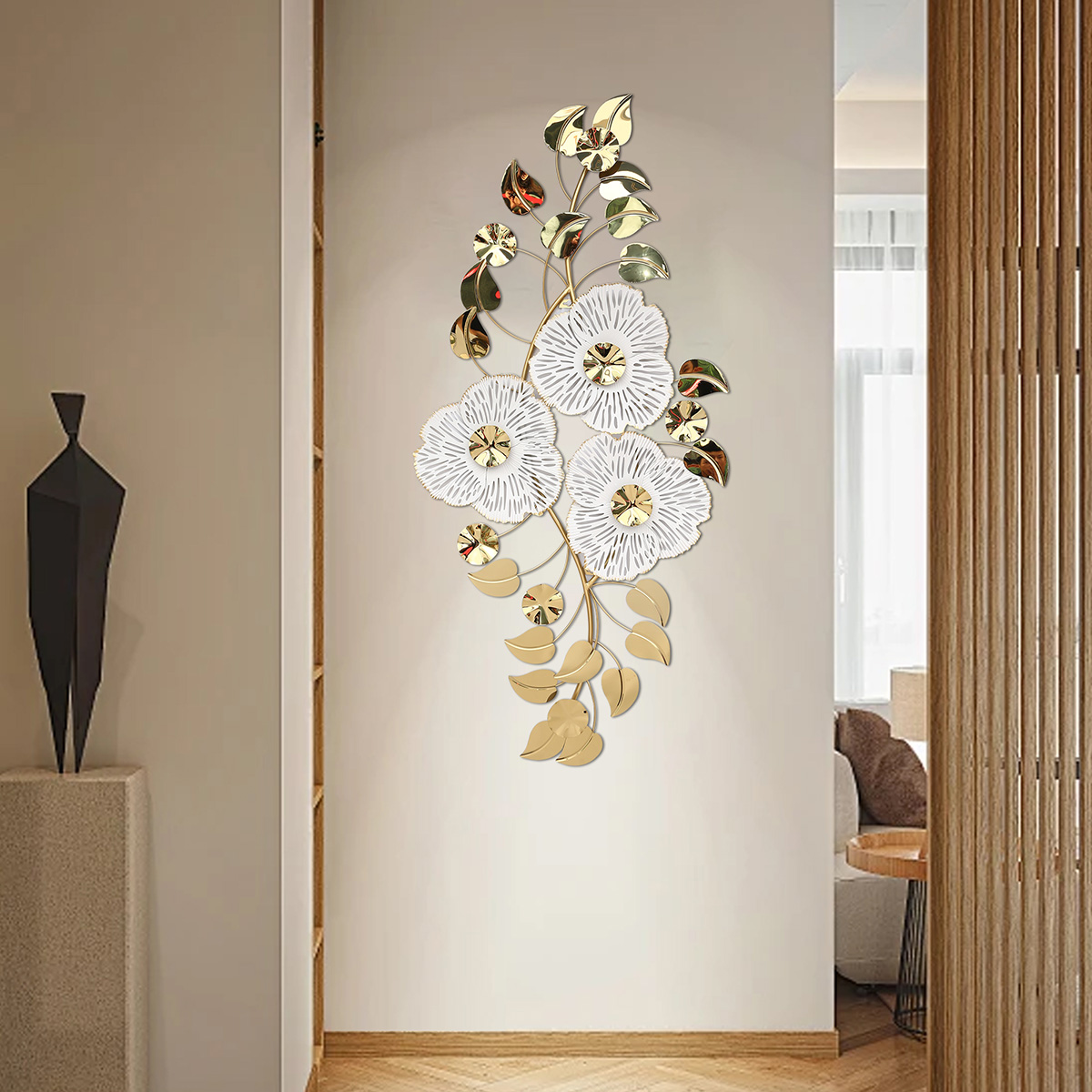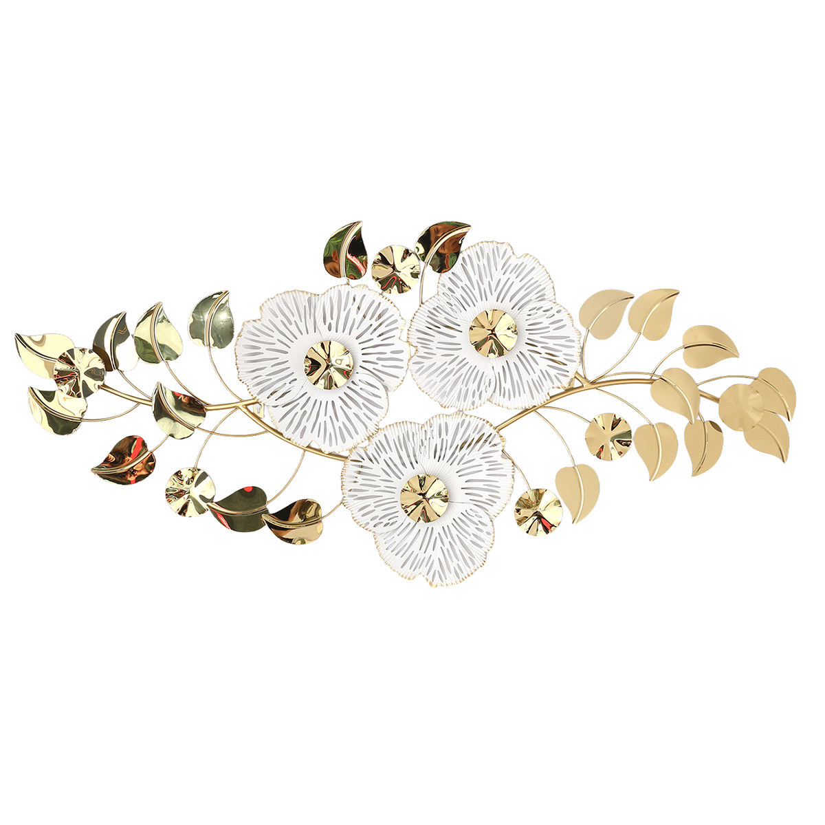 Πίνακας τοίχου μεταλλικός 126Χ60 εκ. Λευκό Χρυσό με λουλούδια και φύλλα - KESKOR 46001