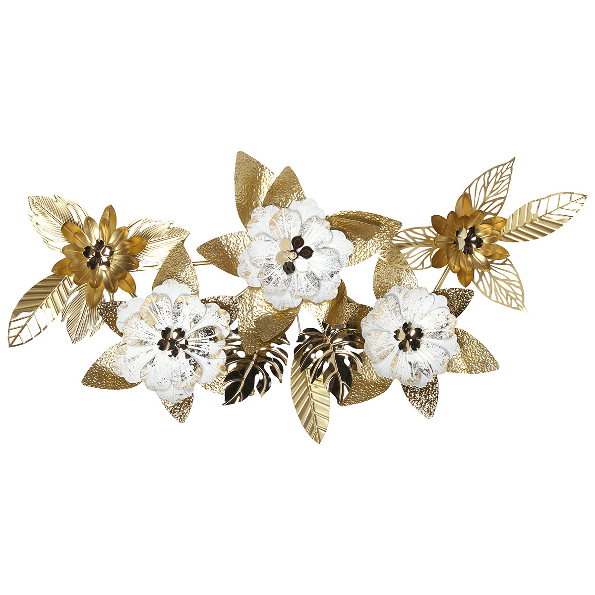 Πίνακας τοίχου μεταλλικός 131Χ63 εκ. Λευκός Χρυσός με λουλούδια και φύλλα Αυτός ο πίνακας τοίχου μεταλλικός 131Χ63 εκ. σε λευκό-χρυσό φινίρισμα συνδυάζει μοντέρνο design με κλασική κομψότητα. Τα ανάγλυφα λουλούδια και φύλλα δίνουν μια τρισδιάστατη αίσθηση, δημιουργώντας ένα εκλεπτυσμένο διακοσμητικό στοιχείο για κάθε χώρο.