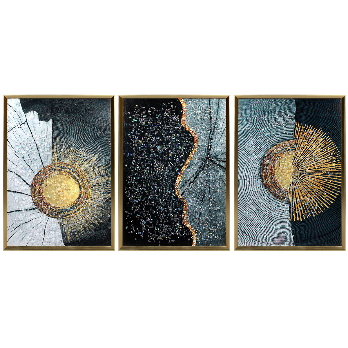 Πίνακας τοίχου ξύλινος 3πτυχος 150Χ70 εκ. με χρυσή κορνίζα από PS και ανάγλυφα strass. Το σετ αποτελείται από 3 πίνακες με διάσταση 50Χ70 εκ. Αυτός ο πίνακας τοίχου είναι ξύλινος και 3πτυχος, με διαστάσεις 150Χ70 εκ. και χρυσή κορνίζα από PS. Περιλαμβάνει ανάγλυφα strass που προσθέτουν μια αίσθηση πολυτέλειας και λάμψης. Το σετ αποτελείται από 3 πίνακες με διάσταση 50Χ70 εκ. καθένας, ιδανικοί για να διακοσμήσουν τον τοίχο σας με στυλ και κομψότητα.